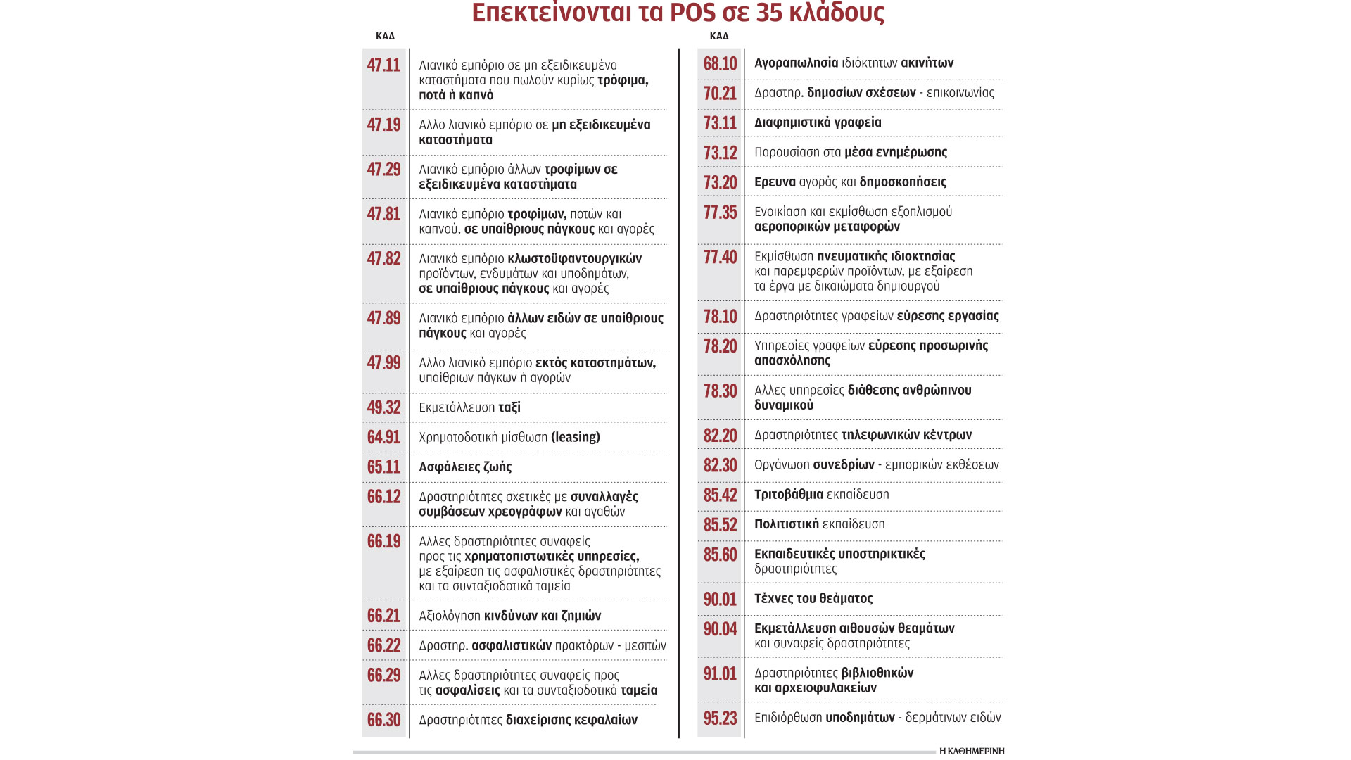 Στην επέκταση των τερματικών POS σε 35 (ΚΑΔ) κλάδους της ελληνικής οικονομίας προχωράει το οικονομικό επιτελείο της κυβέρνησης από την 1η Ιανουαρίου 2024. Σύμφωνα με το σχέδιο απόφασης, καλύπτεται πλέον το 100% της οικονομικής δραστηριότητας και αμέσως μετά την ψήφιση του φορολογικού νομοσχεδίου θα δημοσιοποιηθούν οι όροι και τα πρόστιμα σε όσους δεν συμμορφωθούν.