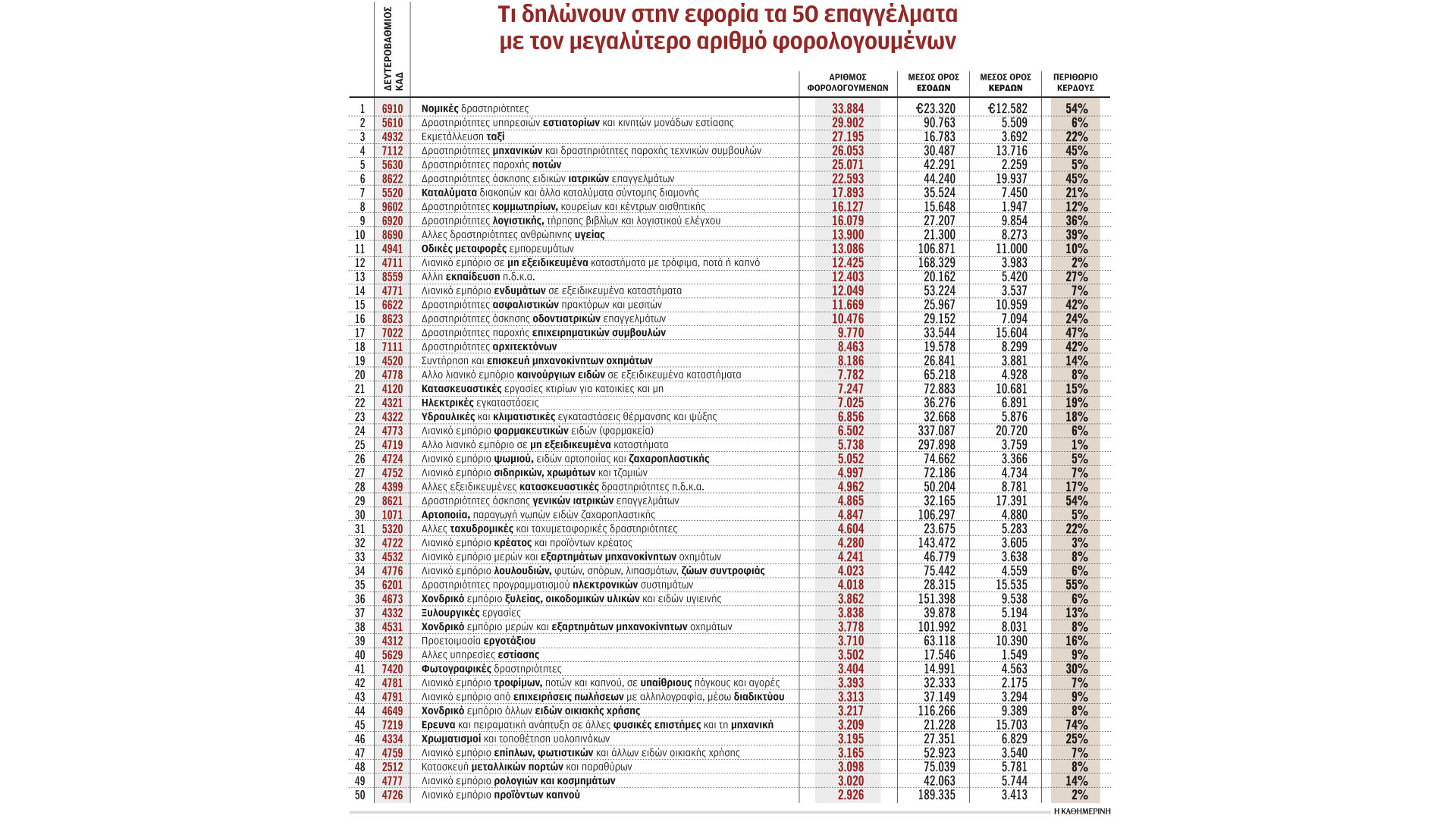 • Μόνο τέσσερις τομείς εμφανίζουν καθαρό μέσο ετήσιο κέρδος άνω των 50.000 ευρώ και αυτοί απαριθμούν… 39 επαγγελματίες.