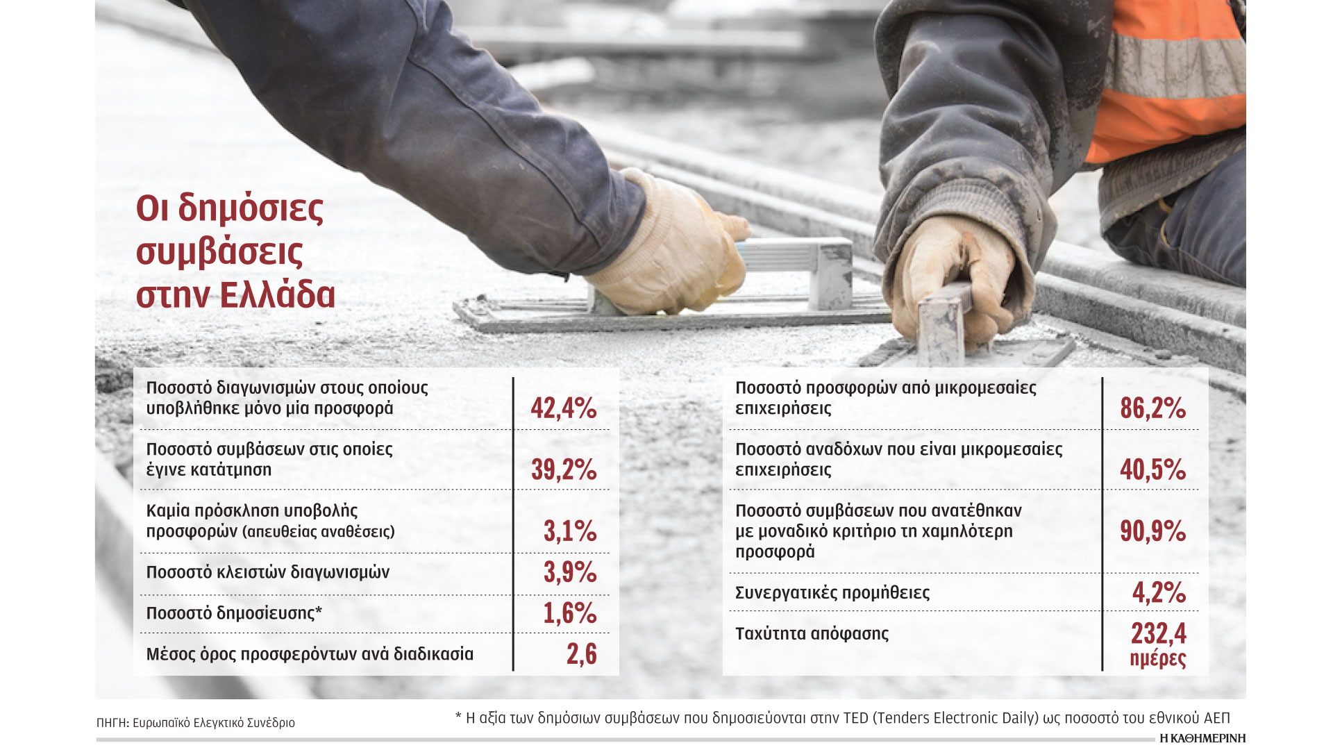 Πάνω από τέσσερις στις δέκα δημόσιες συμβάσεις ανατίθενται ύστερα από διαδικασίες στις οποίες υπήρχε μόνο μία προσφορά, ενώ ακόμη και όταν υπάρχουν πάνω από μία προσφορές ο μέσος όρος ανά διαδικασία είναι μόλις 2,6 συμμετέχοντες.