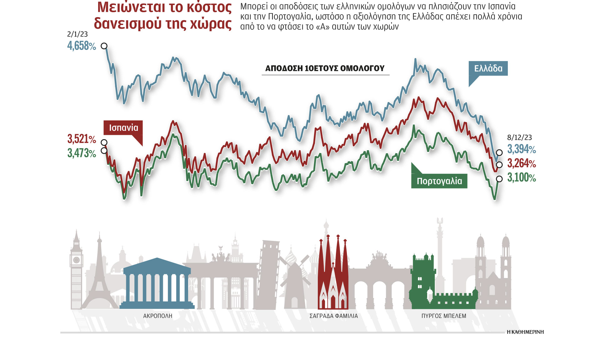 Σύμφωνα με του οίκους αξιολόγησης, η Ελλάδα, η Πορτογαλία και η Ισπανία έχουν παρόμοια δημοσιονομικά θεμελιώδη μεγέθη – πλην φυσικά του χρέους που είναι πολύ υψηλό στην Ελλάδα, έχει ωστόσο ευνοϊκή δομή. Οπως επισημαίνουν και παράγοντες της αγοράς, για να καταφέρει η Ελλάδα να «πιάσει» τις παραπάνω χώρες και να βρεθεί στην κατηγορία του «Α» όπου ήταν πριν από την κρίση χρέους –αυτό που θα σηματοδοτούσε και την πλήρη κανονικότητα–, έχει ακόμη περίπου δέκα χρόνια μπροστά της, με βάση το πώς κινούνται οι οίκοι.