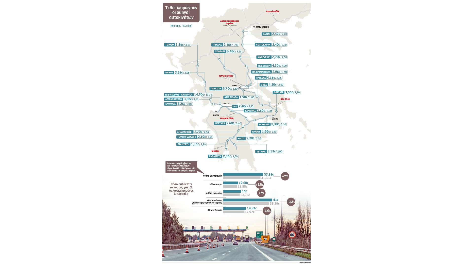•Η διαδρομή Αθήνας – Τρικάλων (μέσω Ε65) θα κοστίζει 19,35 ευρώ από 17,95 ευρώ σήμερα (αύξηση 7,6%).
