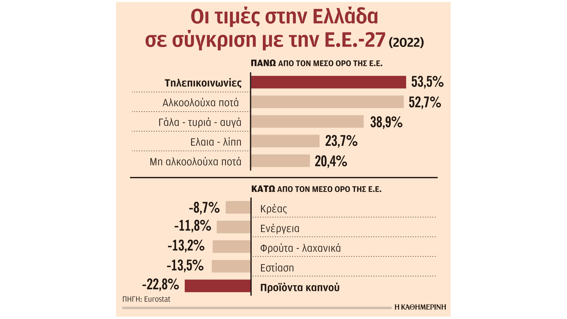 Από την άλλη, το πλέον φθηνό προϊόν στην Ελλάδα, συγκριτικά με τις άλλες χώρες της Ε.Ε., είναι τα προϊόντα καπνού, με την τιμή τους το 2020 να διαμορφώνεται σε επίπεδα 22,8% κάτω από τον ευρωπαϊκό μέσο όρο.