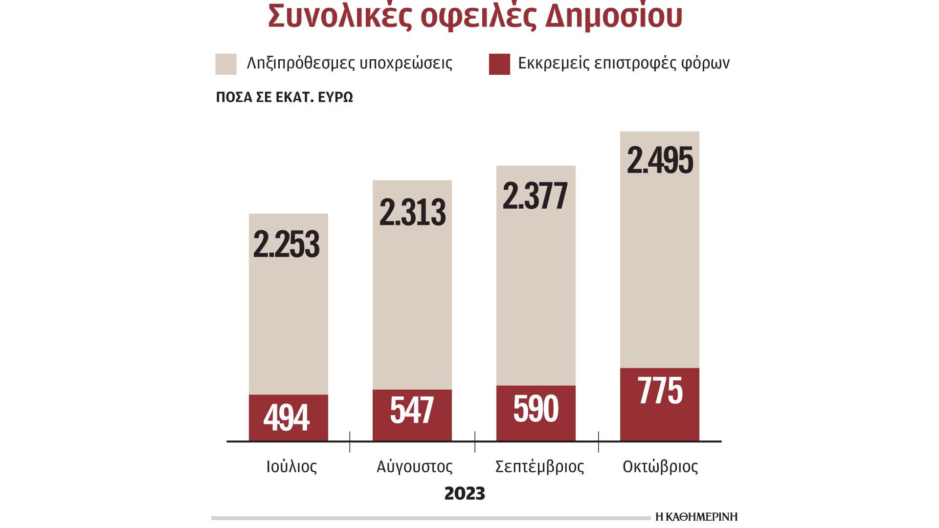 Στα 2,495 δισ. ευρώ σκαρφάλωσαν οι ληξιπρόθεσμες υποχρεώσεις της γενικής κυβέρνησης τον Οκτώβριο, από 2,097 δισ. ευρώ τον Ιούλιο, σύμφωνα με το δελτίο Γενικής Κυβέρνησης, το οποίο επιβεβαίωσε τις σχετικές ανησυχίες που εξέφρασαν προχθές τόσο η Ευρωπαϊκή Επιτροπή στη μεταπρογραμματική της έκθεση όσο και το Γραφείο Προϋπολογισμού του Κράτους στη Βουλή στην τριμηνιαία του έκθεση. Επιπλέον, τα ίδια στοιχεία δείχνουν ότι οι εκκρεμείς επιστροφές φόρων ήταν 775 εκατ. ευρώ.