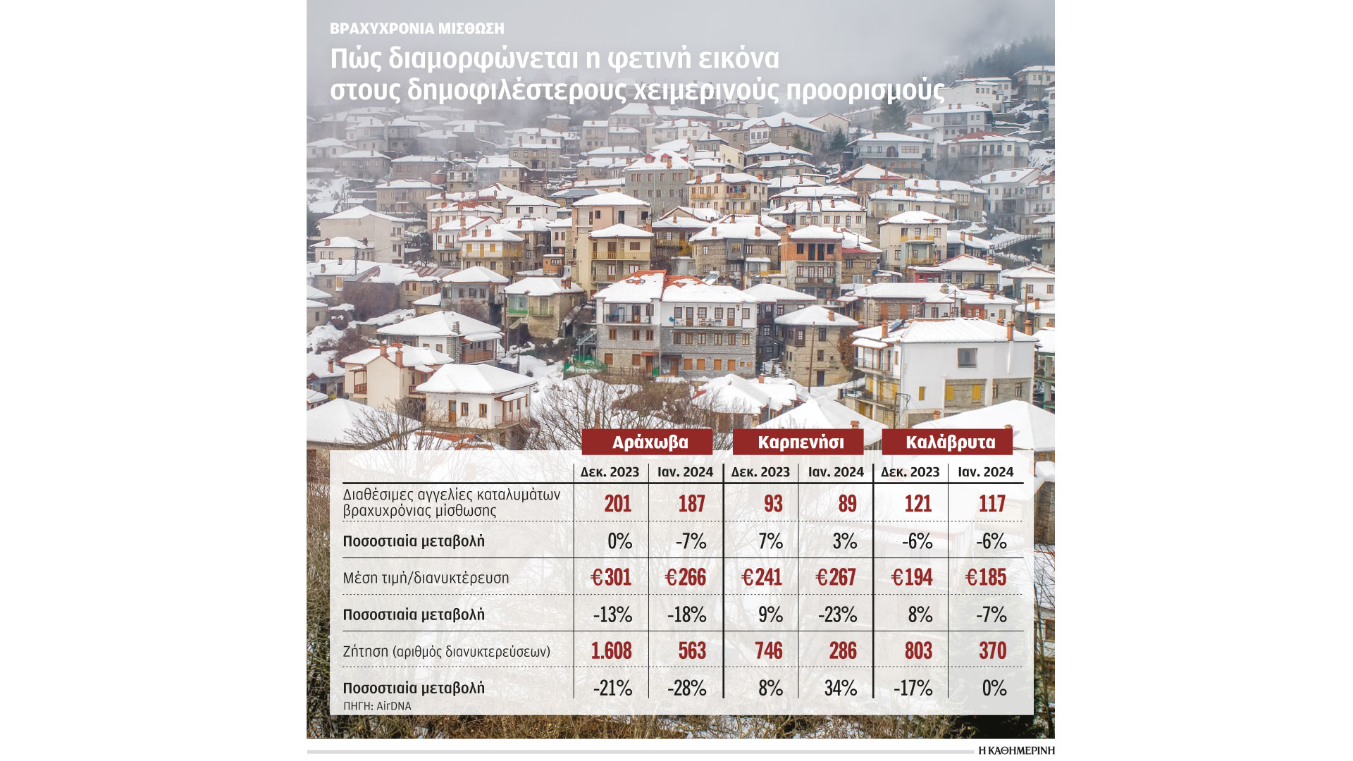 Χαμηλότερες σε σχέση με τον περυσινό χειμώνα εμφανίζονται οι επιδόσεις των καταλυμάτων βραχυχρόνιας μίσθωσης που βρίσκονται στους δημοφιλέστερους χειμερινούς προορισμούς, όπως η Αράχωβα και τα Καλάβρυτα. Οπως φαίνεται, το κύμα ακρίβειας κατά τη διάρκεια του τελευταίου χρόνου και οι ήπιες καιρικές συνθήκες έχουν λειτουργήσει αρνητικά για την προσέλκυση περισσότερων επισκεπτών. Υπενθυμίζεται ότι οι συγκεκριμένοι προορισμοί απευθύνονται σχεδόν αποκλειστικά σε Ελληνες επισκέπτες, κάτι που εκ των πραγμάτων περιορίζει την απήχησή τους.