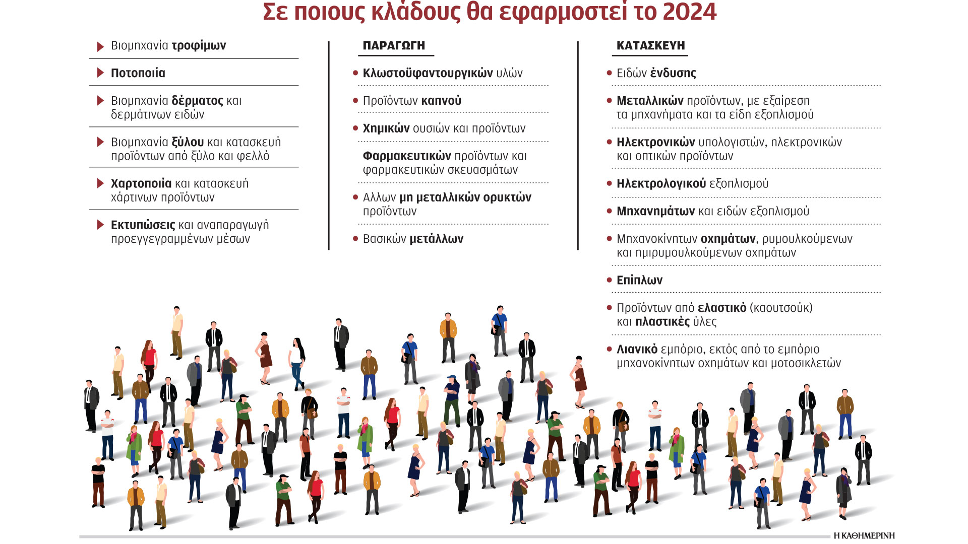 Για τις επιχειρήσεις που ανήκουν στον κλάδο της βιομηχανίας, οι διοικητικές κυρώσεις σε περίπτωση που δεν εφαρμόζεται το μέτρο ισχύουν από την 1η Απριλίου 2024, καθώς προβλέπεται περίοδος χάριτος 3 μηνών, ενώ για τις επιχειρήσεις που ανήκουν στον κλάδο του λιανεμπορίου η περίοδος χάριτος είναι 4 μήνες, με αποτέλεσμα οι κυρώσεις να ξεκινούν από τη 2α Μαΐου 2024. Σε περίπτωση μικρών επιχειρήσεων και από τους δύο κλάδους, με αριθμό εργαζομένων που δεν υπερβαίνει τους 10, οι διοικητικές κυρώσεις ξεκινούν από τη 13η Μαΐου 2024.