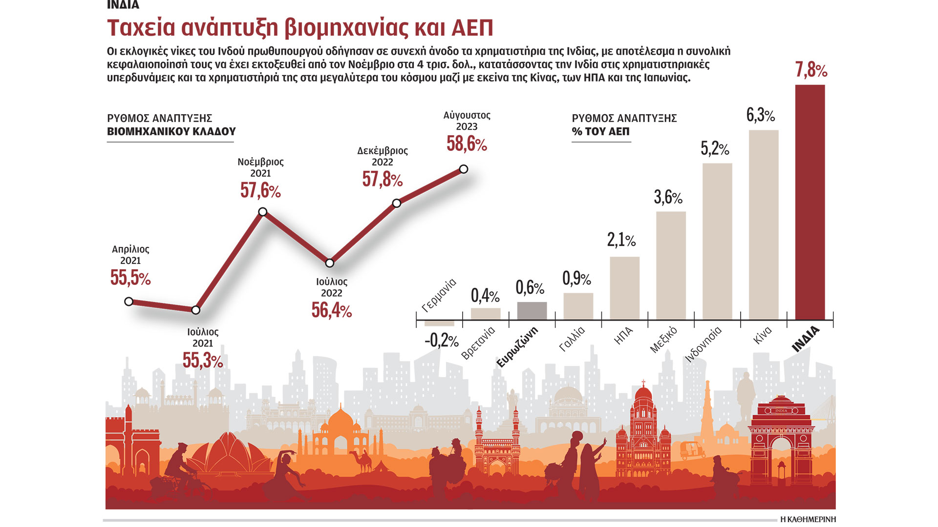 Κατατάσσεται πλέον στις χρηματιστηριακές υπερδυνάμεις, με τη συνολική κεφαλαιοποίηση των δύο ινδικών αγορών να έχει εκτοξευθεί στα 4 τρισ. δολ.