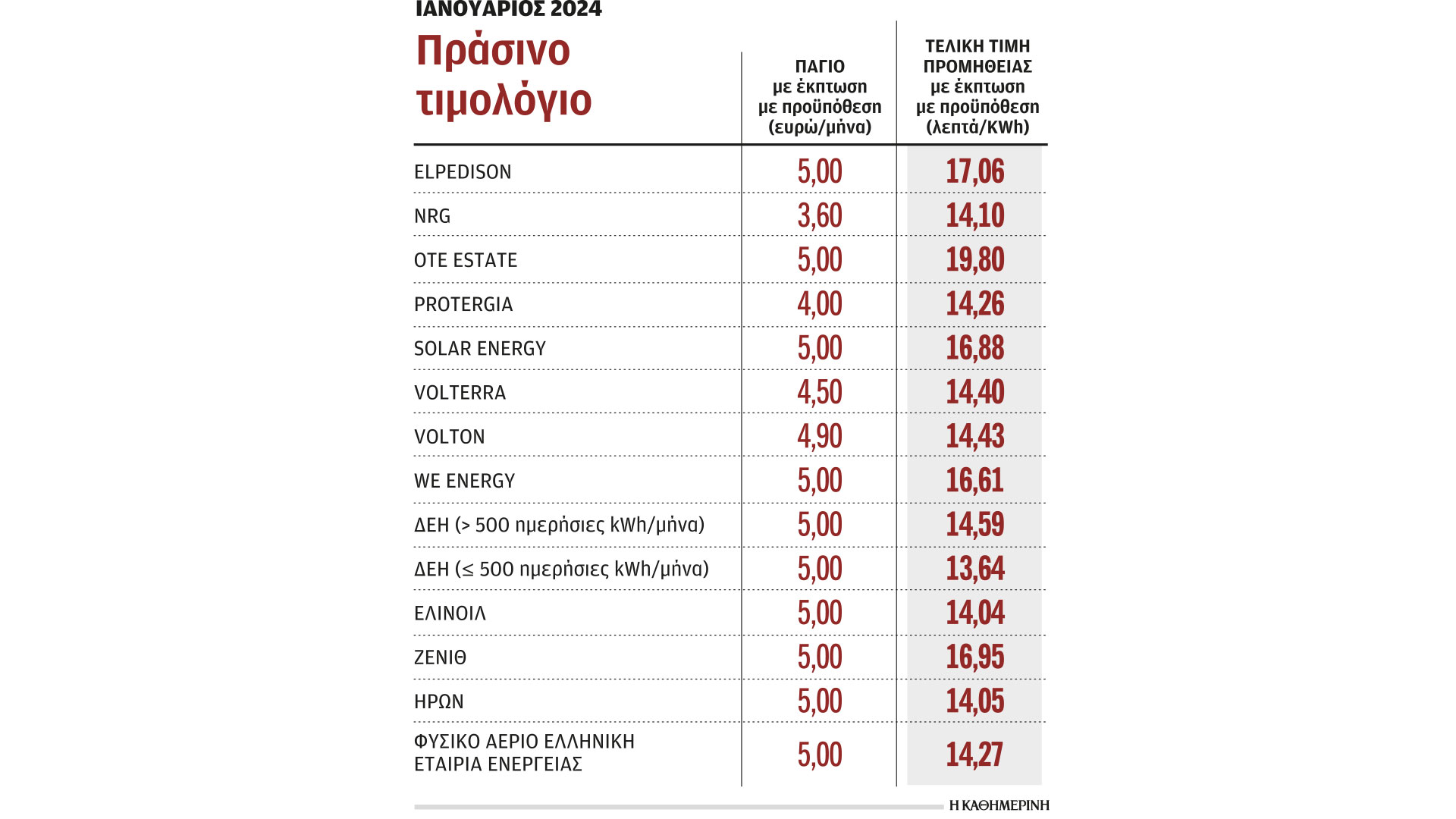 Οι καταναλωτές μπορούν να ανατρέξουν στην ιστοσελίδα όπου η ΡΑΑΕΥ έχει αναρτήσει στον συγκρίσιμο πίνακα τις τιμές των παρόχων στο πράσινο τιμολόγιο.