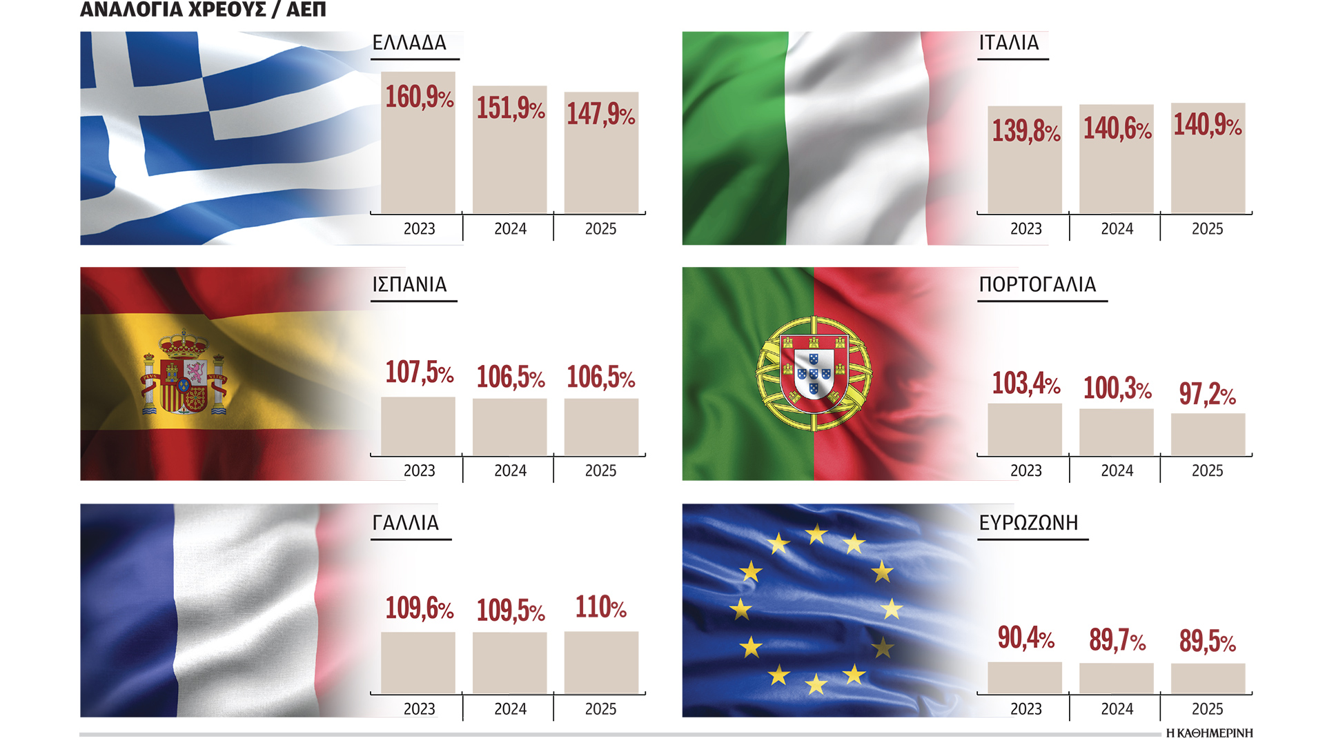 Μπορεί η Κομισιόν να μην αποδέχεται την ελληνική πρόβλεψη ότι το ΑΕΠ θα μεγεθυνθεί φέτος με ρυθμό της τάξεως του 3%, ακόμη και το 2,3% όμως που ενσωματώνει στις μέχρι τώρα προβλέψεις (σ.σ. η χειμερινή επικαιροποίηση αναμένεται τον Φεβρουάριο) είναι το υψηλότερο ποσοστό μεταξύ των χωρών του Νότου, οι οποίες και βαρύνονται με τα περισσότερα χρέη. Η Ιταλία, για παράδειγμα, έχει πρόβλεψη για ανάπτυξη 0,9% και 1,2% αντίστοιχα και η Ευρωζώνη για 1,2% και 1,6% για τα έτη 2024 και 2025. Σε δημοσιονομικό επίπεδο προβλέπεται έλλειμμα γενικής κυβέρνησης 0,9% στην Ελλάδα έναντι 4,4% στην Ιταλία, 3,2% στην Ισπανία και 2,8% στην Ευρωζώνη. Αρα, η σύγκλιση στην αναλογία του χρέους ως προς το ΑΕΠ με τον μέσο όρο της Ευρωζώνης φαίνεται να διασφαλίζεται για τη διετία και από τον αριθμητή και από τον παρονομαστή. Για το 2025 η Ευρωπαϊκή Επιτροπή προβλέπει ότι η αναλογία του χρέους προς το ΑΕΠ θα πέσει κάτω από το 150%, με τον ετήσιο ρυθμό μείωσης και για φέτος και για του χρόνου να είναι πολλαπλάσιος και συγκριτικά με τον στόχο του νέου Συμφώνου Σταθερότητας (σ.σ. τουλάχιστον 1% ετησίως για τις χώρες με αναλογία χρέους προς ΑΕΠ άνω του 90%) αλλά και συγκριτικά με τον μέσο όρο της Ευρωζώνης, ο οποίος εκτιμάται ότι θα παραμείνει στάσιμος στο επίπεδο του 90%.