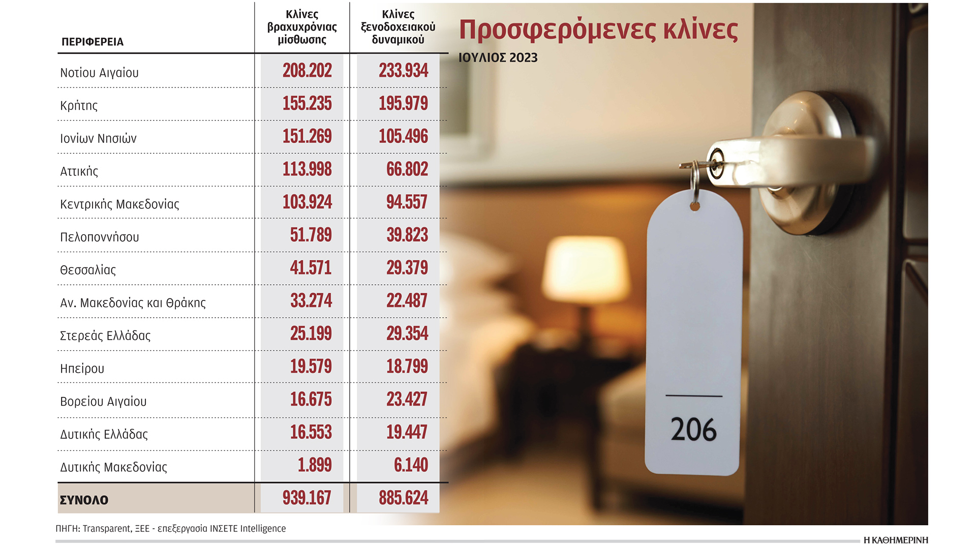 Σύμφωνα με την Ετήσια Εκθεση Ελληνικού Τουρισμού του Ινστιτούτου του Συνδέσμου Ελληνικών Τουριστικών Επιχειρήσεων (ΙΝΣΕΤΕ), η Ελλάδα τον Ιούλιο του 2023 διέθετε 212.199 καταλύματα βραχυχρόνιας μίσθωσης με 392.118 δωμάτια και 939.167 κλίνες. Τα μεγέθη αυτά αντιδιαστέλλονται με τις παραδοσιακές δομές φιλοξενίας, δηλαδή τα ξενοδοχεία, που αριθμούν 10.087 μονάδες με 443.835 δωμάτια και 885.624 κλίνες. Τα ξενοδοχεία, δηλαδή, υστερούν κατά 53.543 κλίνες.