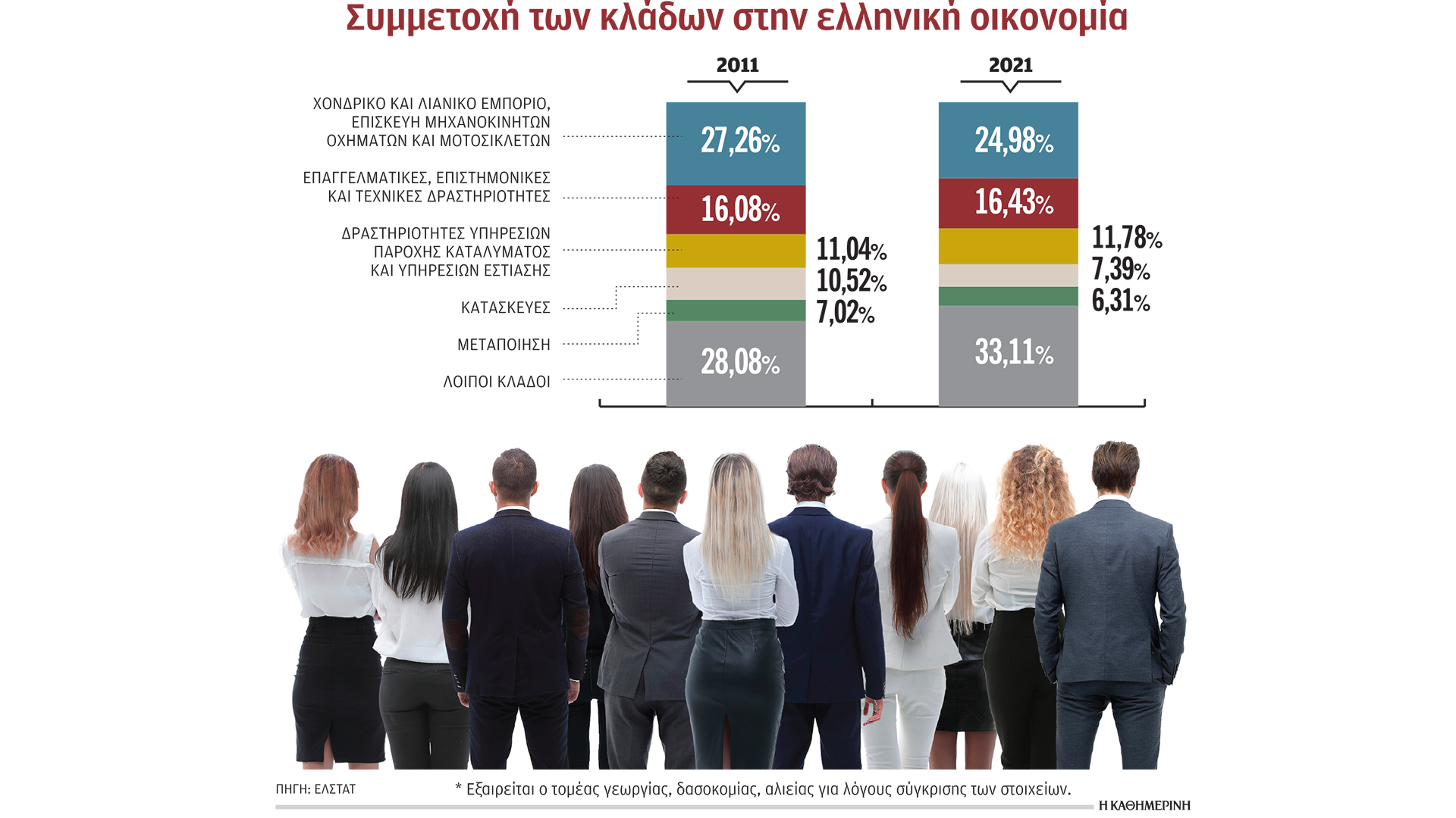 Με την εξαίρεση του παραπάνω κλάδου, το 25% των επιχειρήσεων στην Ελλάδα δραστηριοποιείται στο εμπόριο, χονδρικό και λιανικό, ενώ ένα 16,43% ανήκει στις επαγγελματικές, επιστημονικές και τεχνικές δραστηριότητες. Πρόκειται στην πραγματικότητα για ατομικές επιχειρήσεις-ελεύθερους επαγγελματίες, από ηλεκτρολόγους και υδραυλικούς, μέχρι δικηγόρους, πολιτικούς μηχανικούς και γιατρούς. Το 12% περίπου αφορά επιχειρήσεις του τομέα παροχής καταλύματος και υπηρεσιών εστίασης, το 7,3% είναι επιχειρήσεις του κατασκευαστικού κλάδου, ενώ οι μεταποιητικές επιχειρήσεις αποτελούσαν το 2021 περίπου το 6,3% του συνόλου. Αξίζει να σημειωθεί ότι στο τέλος αυτής της δύσκολης δεκαετίας, οι μεταποιητικές επιχειρήσεις ήταν λιγότερες κατά περίπου 20.000, από 76.343 το 2011 είχαν μειωθεί σε 57.451 το 2021. Οι πιο βαριές απώλειες καταγράφηκαν στην κατηγορία της κατασκευής ειδών ένδυσης με τις επιχειρήσεις να μειώνονται κατά 47,6%, στη βιομηχανία ξύλου (-46%), στην κατασκευή επίπλων (-45%), στην παραγωγή βασικών μετάλλων (-43%). Ακόμη και στον μεγαλύτερο κλάδο της ελληνικής μεταποίησης, που είναι η βιομηχανία τροφίμων, οι επιχειρήσεις το 2021 ήταν λιγότερες κατά 7% ή κατά περίπου 1.000 σε σύγκριση με το 2011. Θα πρέπει, πάντως, να σημειωθεί ότι στη βιομηχανία τροφίμων υπάρχει έντονη κινητικότητα τα τελευταία χρόνια, με την ύπαρξη πολλών πτωχεύσεων και «λουκέτων», αλλά και την πραγματοποίηση πολλών εξαγορών και συγχωνεύσεων.