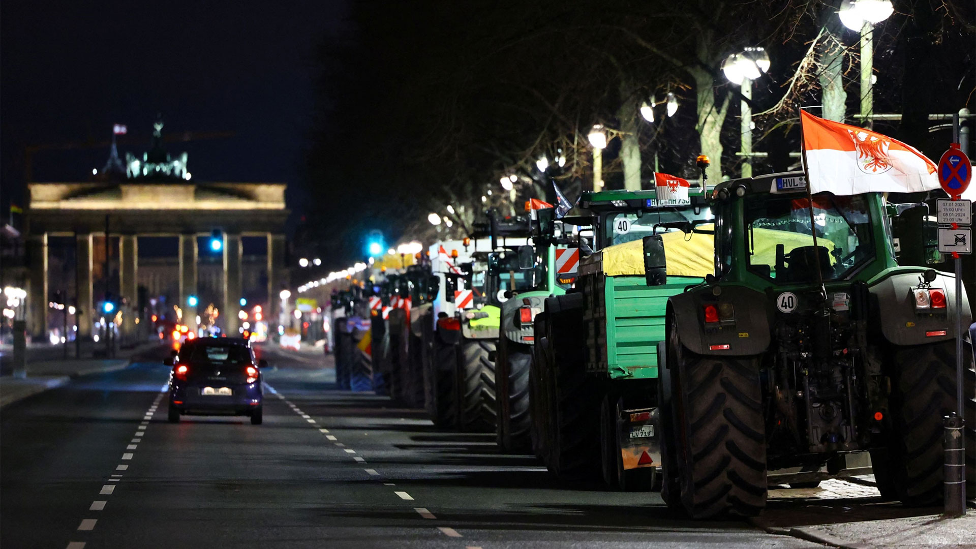 Εικόνες γνώριμες στην Ελλάδα, αλλά μάλλον όχι και τόσο οικείες στη βιομηχανική Γερμανία, γνώρισε χθες το Βερολίνο, όταν περισσότερα από 500 τρακτέρ, σύμφωνα με ορισμένους ίσως 680 τρακτέρ, κατευθύνθηκαν στην Πύλη του Βρανδεμβούργου όπου και στάθμευσαν, προσφέροντας ένα θέαμα κάθε άλλο παρά σύνηθες στο ιστορικό κέντρο της γερμανικής πρωτεύουσας. Την ίδια στιγμή, εκατοντάδες άλλα τρακτέρ έκλειναν οδικές αρτηρίες της χώρας, καθώς Γερμανοί αγρότες προχώρησαν σε αποκλεισμούς δρόμων και εθνικών οδών στα κρατίδια της Βάδης-Βυρτεμβέργης, της Βόρειας Ρηνανίας-Βεστφαλίας, της Σαξονίας και της Βαυαρίας σε μια ασυνήθη κινητοποίηση που εμπόδισε την κίνηση στη χώρα και τη μεταφορά καυσίμων σε περιοχές του νότου της χώρας.
