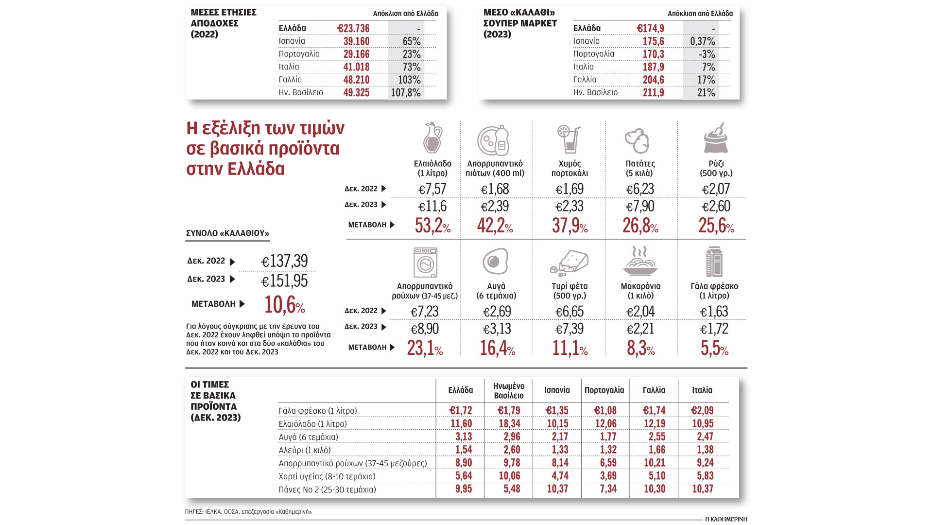 Φθηνότερο σε σχέση με άλλες ευρωπαϊκές χώρες, αλλά όχι φθηνό, αποδεικνύεται ότι είναι ένα τυπικό «καλάθι» του σούπερ μάρκετ, καθώς η απόκλισή του σε σχέση με τις άλλες χώρες είναι πολύ μικρή, ενώ η διαφορά μεταξύ των εισοδημάτων σε Ελλάδα και Ευρώπη φτάνει σε ορισμένες περιπτώσεις να είναι ακόμη και… χαοτική. Ετσι, το μέσο «καλάθι» στο Ηνωμένο Βασίλειο μπορεί να είναι ακριβότερο κατά 21% από το αντίστοιχο στην Ελλάδα, όμως την ίδια ώρα οι μέσες ετήσιες αποδοχές στη Γηραιά Αλβιώνα είναι υπερδιπλάσιες από αυτές που ισχύουν στην Ελλάδα. Ακόμη και στην Πορτογαλία, όπου οι τιμές σημειωτέον στα βασικά είδη παντοπωλείου είναι χαμηλότερες από αυτές στην Ελλάδα, οι μέσες ετήσιες αποδοχές είναι κατά 23% υψηλότερες από ό,τι στην Ελλάδα.