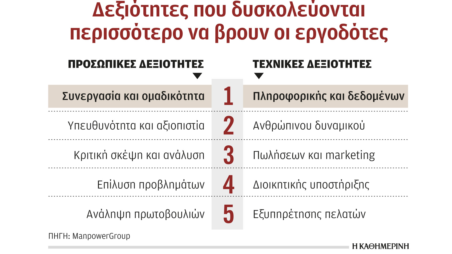 Ανάμεσα στις τέσσερις πρώτες χώρες του κόσμου –μαζί με την Ιαπωνία, τη Γερμανία και το Ισραήλ– στις οποίες παρατηρείται υψηλότερο ποσοστό έλλειψης ταλέντων διεθνώς βρίσκεται η Ελλάδα. Το 82% των εργοδοτών στη χώρα μας, ποσοστό υψηλότερο από κάθε άλλη φορά τα τελευταία 11 χρόνια, δηλώνει σοβαρή δυσκολία να βρει εξειδικευμένα ταλέντα. Η Ετήσια Διεθνής Ερευνα Ελλειψης Ταλέντου που πραγματοποίησε ο όμιλος ManpowerGroup για το 2024 (σε 40.077 εργοδότες σε 41 χώρες, συμπεριλαμβανομένων 525 Ελλήνων εργοδοτών) αποτυπώνει υψηλό ρεκόρ 11ετίας για την Ελλάδα, ενώ το ποσοστό εμφανίζεται κατά 7% υψηλότερο από τον παγκόσμιο μέσο όρο (75%).