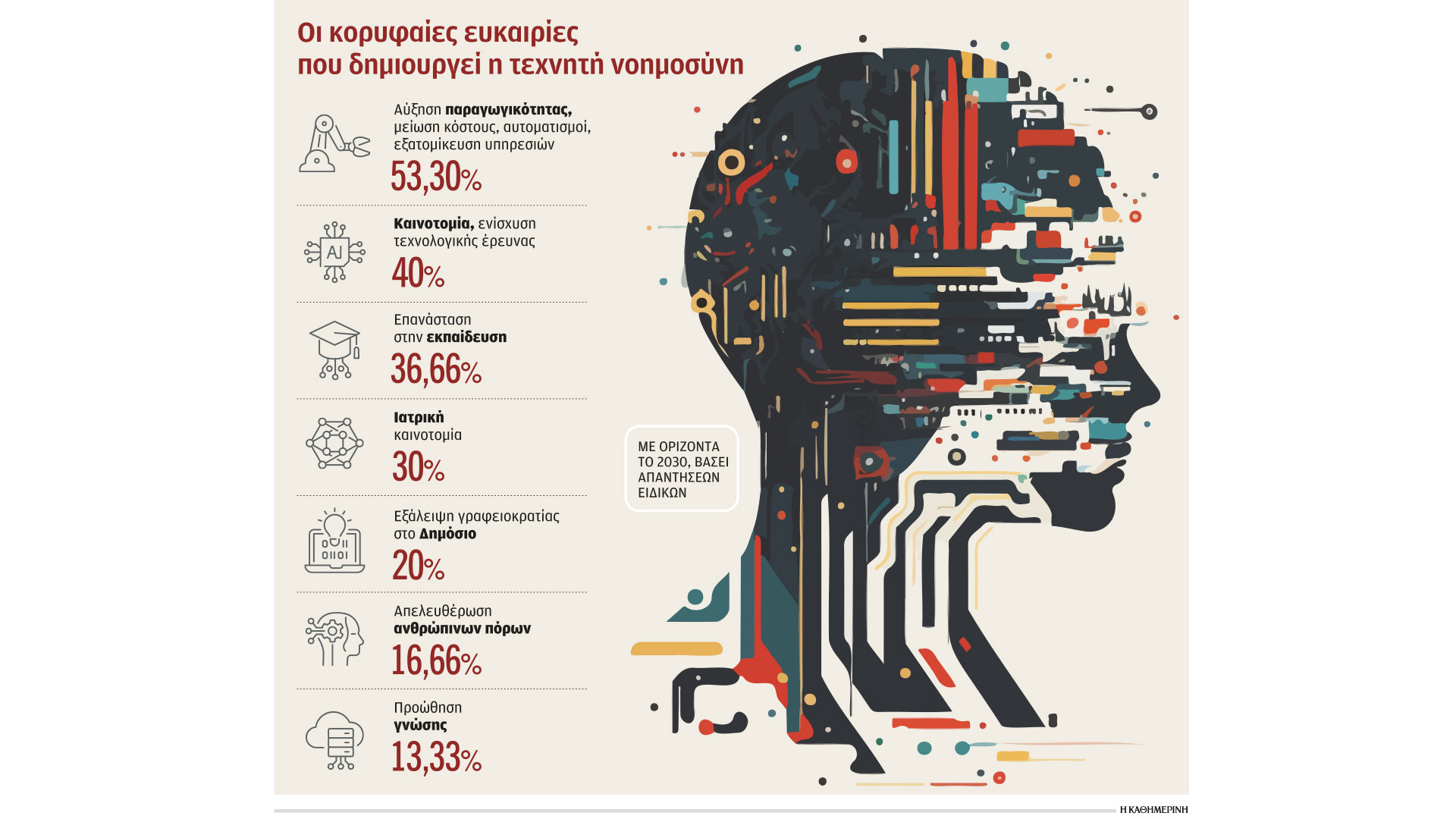 Σύμφωνα με τη μελέτη που εκπόνησε το Εθνικό Κέντρο Κοινωνικών Ερευνών και το Εθνικό Κέντρο Ερευνας Φυσικών Επιστημών «Δημόκριτος», με την υποστήριξη της Ειδικής Γραμματείας Μακροπρόθεσμου Σχεδιασμού, και παρουσιάστηκε χθες στο Μέγαρο Μαξίμου για τις προοπτικές της τεχνητής νοημοσύνης στην Ελλάδα με χρονικό ορίζοντα το 2030, η συμβολή της στον μετασχηματισμό του κράτους και του ιδιωτικού τομέα είναι καθοριστική.
