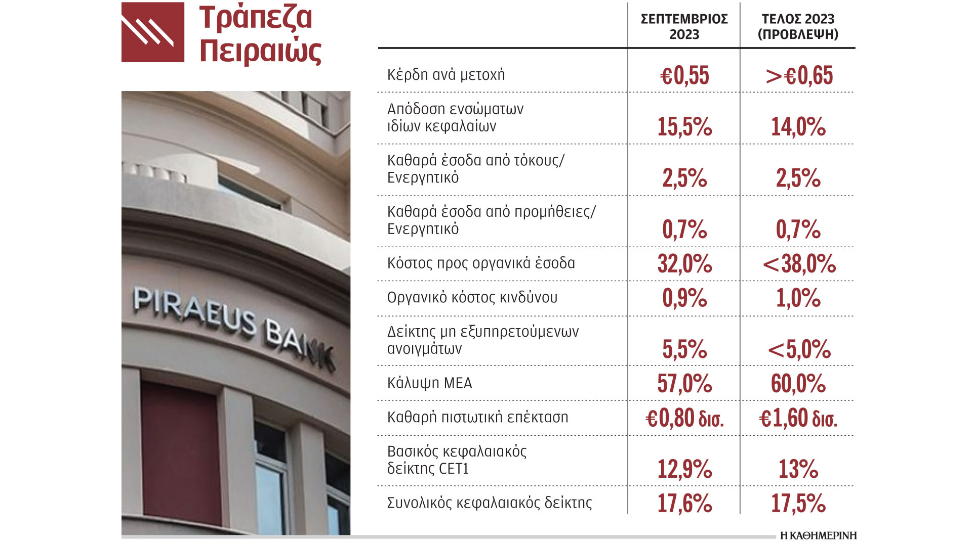 Η διοίκηση της τράπεζας κατά τις επαφές της στο Λονδίνο έδωσε guidance για κερδοφορία άνω του 1 δισ. ευρώ ετησίως για την επόμενη τριετία, ενώ η απόδοση ιδίων κεφαλαίων αναμένεται να διαμορφωθεί στο 14% για το 2023. Οπως προκύπτει από την παρουσίαση των βασικών οικονομικών μεγεθών, η μετοχή της τράπεζας διαπραγματεύεται 0,65 φορά την ενσώματη λογιστική της αξία έναντι 0,87 του ευρωπαϊκού μέσου όρου, υποδηλώνοντας δυνατότητα premium 34% από την τρέχουσα αποτίμηση της μετοχής της. Με βάση τα στοιχεία για το κλείσιμο του έτους, τα κέρδη ανά μετοχή θα διαμορφωθούν σε 0,65 ευρώ, ο βασικός δείκτης κεφαλαιακής επάρκειας θα διαμορφωθεί στο 13% (ο συνολικός δείκτης στο 17,5%) και ο δείκτης μη εξυπηρετούμενων δανείων θα μειωθεί περαιτέρω κάτω από 5%.