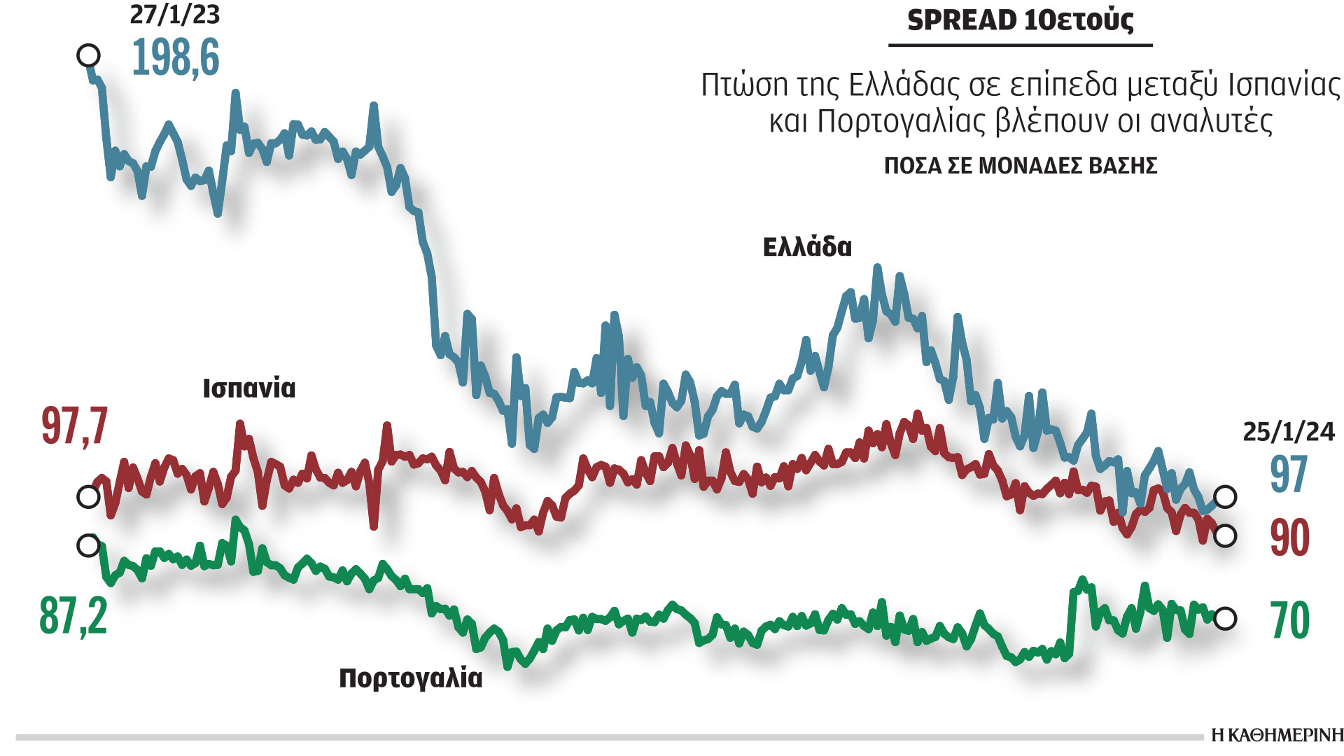 Περαιτέρω σημαντική συρρίκνωση του ελληνικού spread (έναντι της Γερμανίας) κατά 30 μονάδες βάσης βλέπει από την πλευρά της η Bank of America, θεωρώντας πως θα πρέπει να διαπραγματεύεται μεταξύ του ισπανικού (ήταν στις 90 μ.β. την Παρασκευή) και του πορτογαλικού spread (70 μ.β.) το επόμενο διάστημα.