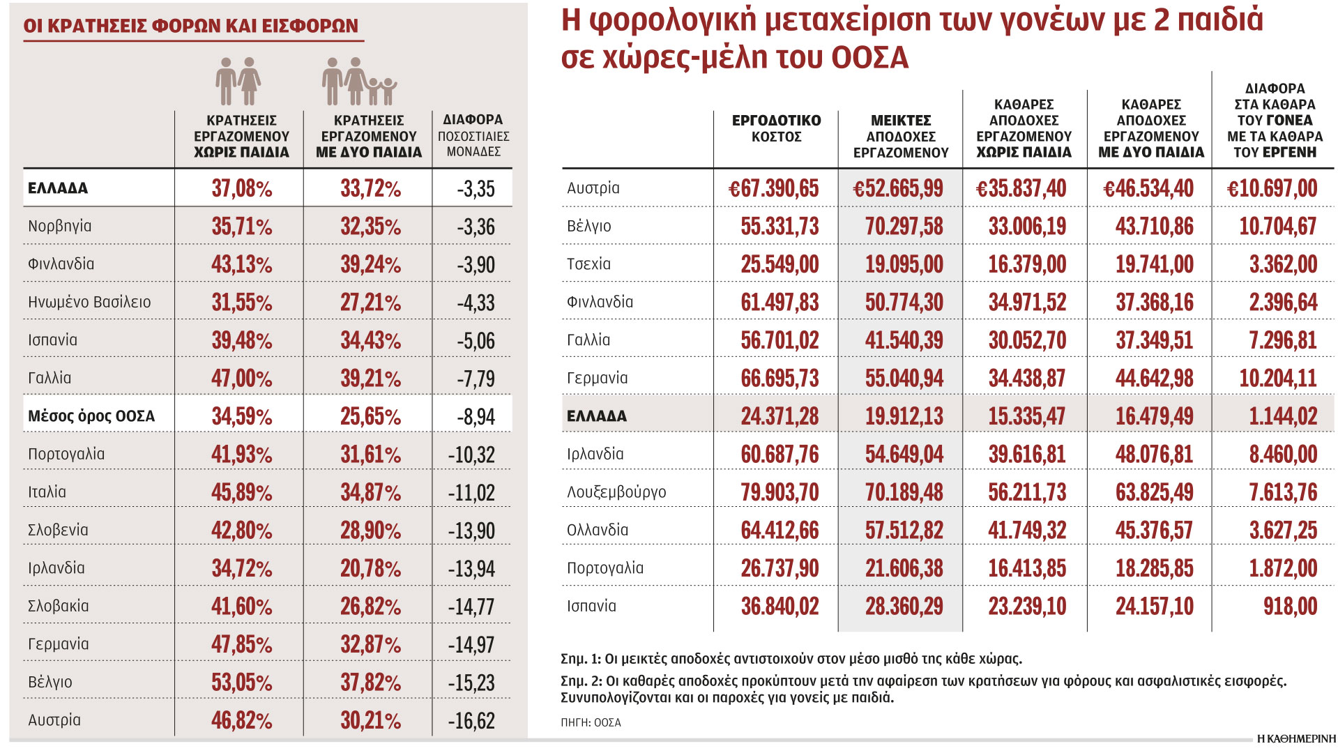Οι καθαρές αποδοχές του εργαζομένου στην Ελλάδα που έχει δύο παιδιά βελτιώνονται λόγω της φορολογικής και επιδοματικής πολιτικής κατά 1.144 ευρώ τον χρόνο συγκριτικά με τις αντίστοιχες του εργένη. Αυξάνονται δηλαδή από τα 15.335 ευρώ στα 16.479 ευρώ. Η αντίστοιχη αύξηση στον μέσο εργαζόμενο στην Αυστρία είναι 10.697 ευρώ τον χρόνο ή από τα 35.837 ευρώ στα 46.534 ευρώ, ενώ στην Ιρλανδία διαμορφώνεται στα 8.460 ευρώ.