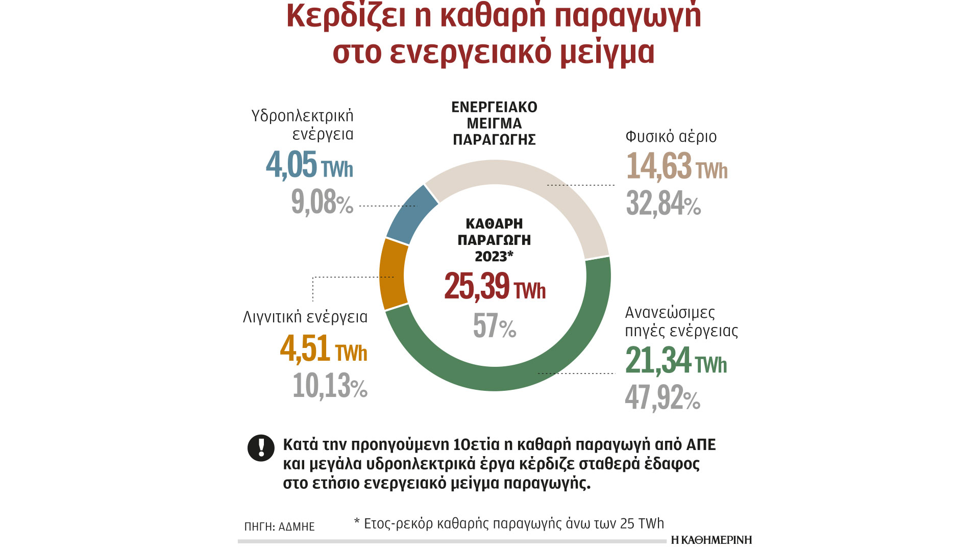 Ιστορικό ρεκόρ κατέγραψε η παραγωγή καθαρής, ηλεκτρικής ενέργειας στην Ελλάδα το 2023. Σύμφωνα με τα στοιχεία του ΑΔΜΗΕ, το 57% του ενεργειακού μείγματος καλύφθηκε από ανανεώσιμες πηγές ενέργειας (αέρα – ήλιο) και υδροηλεκτρικές μονάδες, ξεπερνώντας τις 25 TWh. Το 2022 το αντίστοιχο ποσοστό ήταν 50,12%. Τον Αύγουστο του 2023 μάλιστα πραγματοποιήθηκε η μεγαλύτερη μηνιαία παραγωγή από ΑΠΕ στην ιστορία του ηλεκτρικού συστήματος της χώρας (2,25 TWh), το οποίο «πρασινίζει» με ταχύτατους ρυθμούς τα τελευταία χρόνια.
