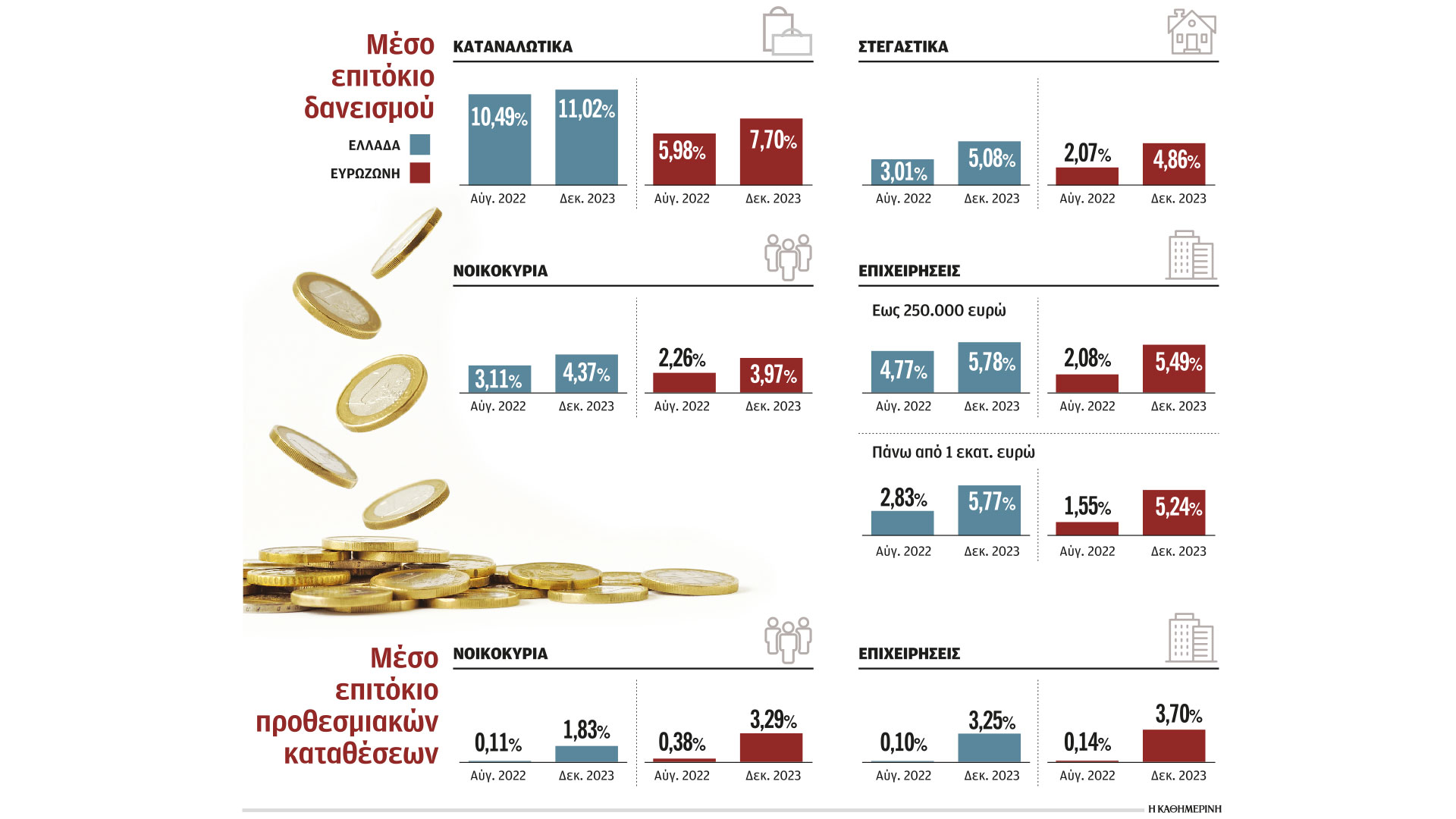 Σύμφωνα με τα στοιχεία της ΤτΕ και της ΕΚΤ, το μέσο επιτόκιο για στεγαστικά δάνεια διαμορφώθηκε τον Δεκέμβριο στη χώρα μας στο 5,08% έναντι 4,86% στην Ευρωζώνη, περιορίζοντας τη διαφορά σε σχέση με ενάμιση χρόνο πριν, που τα αντίστοιχα επιτόκια ήταν 3,01% και 2,07%. Πιο δειλή, με συνέπεια τη διατήρηση σημαντικής διαφοράς, είναι η σύγκλιση στο κόστος δανεισμού για καταναλωτικές ανάγκες με το μέσο επιτόκιο για καταναλωτικά δάνεια να διαμορφώνεται στη χώρα μας στο 11,02% έναντι μέσου όρου 7,70% στην Ευρωζώνη. Να σημειωθεί πάντως ότι οι τράπεζες της Ευρωζώνης αύξησαν με ταχύτερο ρυθμό τα επιτόκια για καταναλωτικά δάνεια, με συνέπεια η διαφορά έναντι της Ελλάδας να περιοριστεί στις 3,32 μονάδες τον Δεκέμβριο του 2023 έναντι 4,51 μονάδες τον Αύγουστο του 2023.