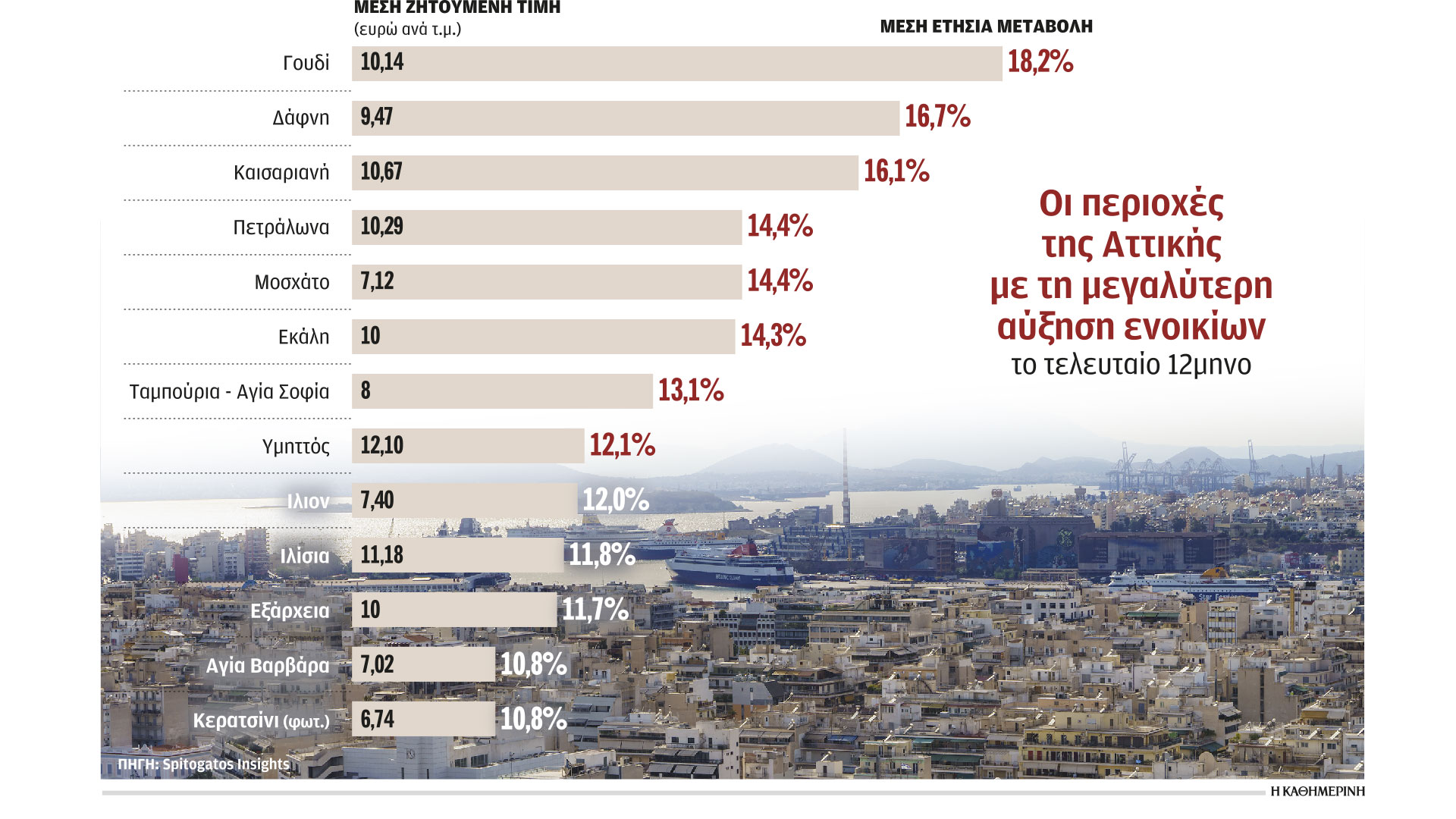 Σημειώνεται ότι η σωρευτική αύξηση των ενοικίων την περίοδο 2018-2022 άγγιξε το 50%, ενώ υπολογίζεται ότι το 2023 η ετήσια αύξηση στα ενοίκια ξεπέρασε στην Αθήνα το 23,7%, στη Θεσσαλονίκη το 22,7%, στην Πάτρα το 27,47% και στο Ηράκλειο Κρήτης το 16,53%.