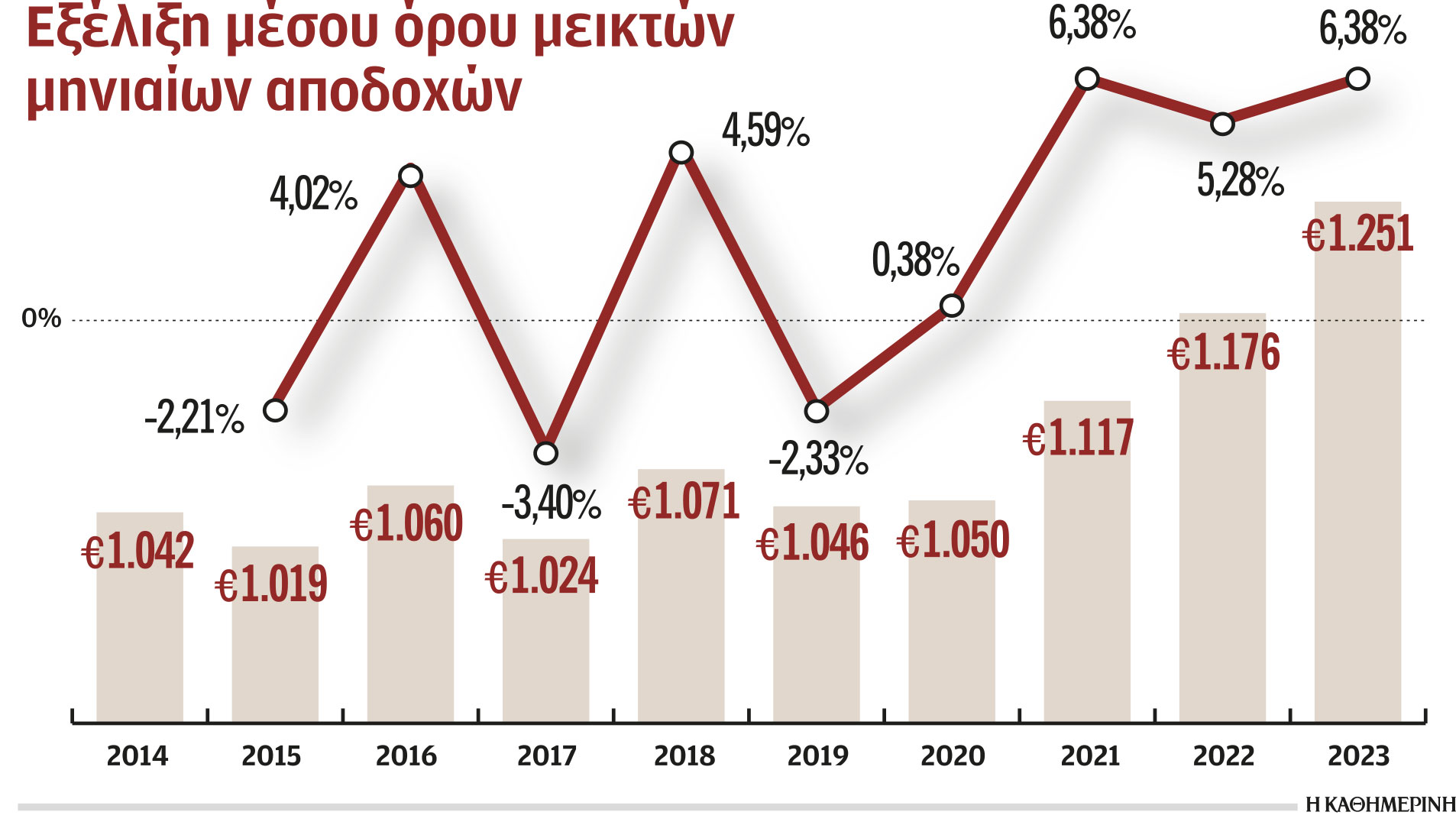 Από την επεξεργασία των στοιχείων του πληροφοριακού συστήματος «Εργάνη» προκύπτει ότι οι μέσες μηνιαίες μεικτές αποδοχές (όπως προκύπτει από το σύνολο των μηνιαίων μεικτών αποδοχών που κατέβαλαν οι εργοδότες διά του αριθμού των εργαζομένων με σχέση μισθωτής εργασίας ιδιωτικού δικαίου) διαμορφώθηκαν το 2023 σε 1.251 ευρώ έναντι 1.176 ευρώ το 2022, καταγράφοντας αύξηση περίπου 6,4%. Πρόκειται για το υψηλότερο ποσό των τελευταίων δέκα ετών, αλλά εξακολουθεί να υστερεί σε σχέση με τα προ οικονομικής κρίσης επίπεδα.