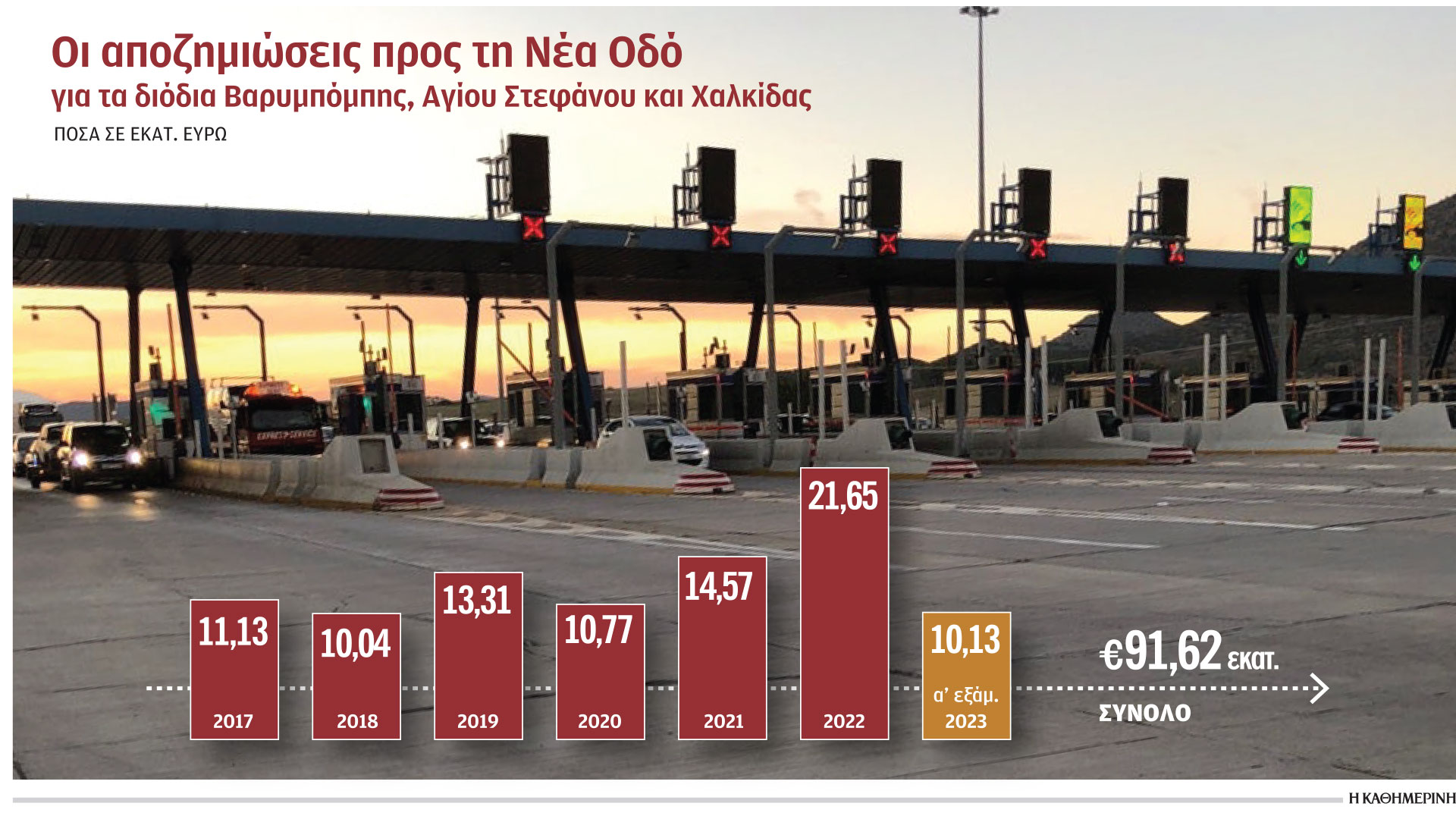 Μέσω αυτών των συμφωνιών, η παραχωρησιούχος Νέα Οδός έχει λάβει συνολικά 91,6 εκατ. ευρώ για το διάστημα από τον Απρίλιο του 2017 μέχρι το καλοκαίρι του 2023. «Η προθεσμία ολοκλήρωσης των απαραίτητων εργασιών παρατάθηκε μέχρι την 31η Δεκεμβρίου 2024, ημερομηνία η οποία συμφωνήθηκε ότι αποτελεί και τη νέα ημερομηνία κατά την οποία θα δικαιούται ο παραχωρησιούχος να θέσει σε λειτουργία και εκμετάλλευση τους πλευρικούς σταθμούς Βαρυμπόμπης και Αγίου Στεφάνου και τον μετωπικό σταθμό διοδίων Χαλκίδας, υπό την προϋπόθεση της προηγούμενης εγκατάστασης και θέσης σε λειτουργία του ηλεκτρονικού συστήματος αναλογικής χρέωσης διοδίων τελών με οπτική αναγνώριση», αναφέρεται.