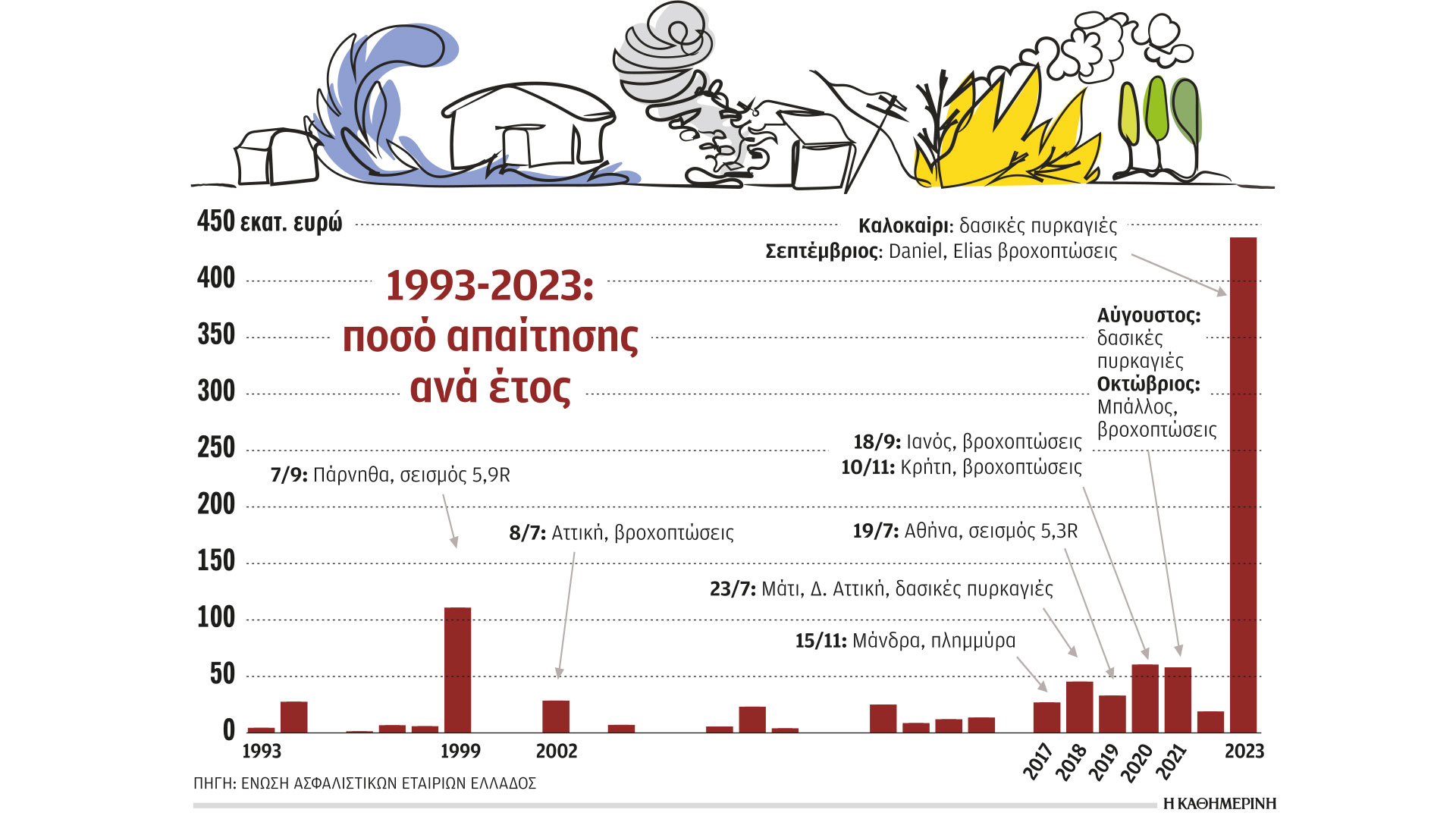 Το 1 δισ. ευρώ περίπου προσεγγίζουν οι ζημιές που αποζημιώθηκαν από τις ασφαλιστικές εταιρείες τα τελευταία 30 χρόνια, με τις μισές από αυτές τις αποζημιώσεις να έχουν πληρωθεί τα τελευταία 5 χρόνια, και το 2023, λόγω των δασικών πυρκαγιών και της κακοκαιρίας «Daniel», να αποτελεί μακράν την πιο καταστροφική χρονιά. Συγκεκριμένα, το 2023 στοίχισε σε αποζημιώσεις για τον ασφαλιστικό κλάδο 404,6 εκατ. ευρώ σε σύνολο 968,5 εκατ. ευρώ που καταβλήθηκαν από το 1993 έως το 2023, επιβεβαιώνοντας ότι η σφοδρότητα της κλιματικής αλλαγής αλλάζει τα δεδομένα και για την ασφαλιστική αγορά.