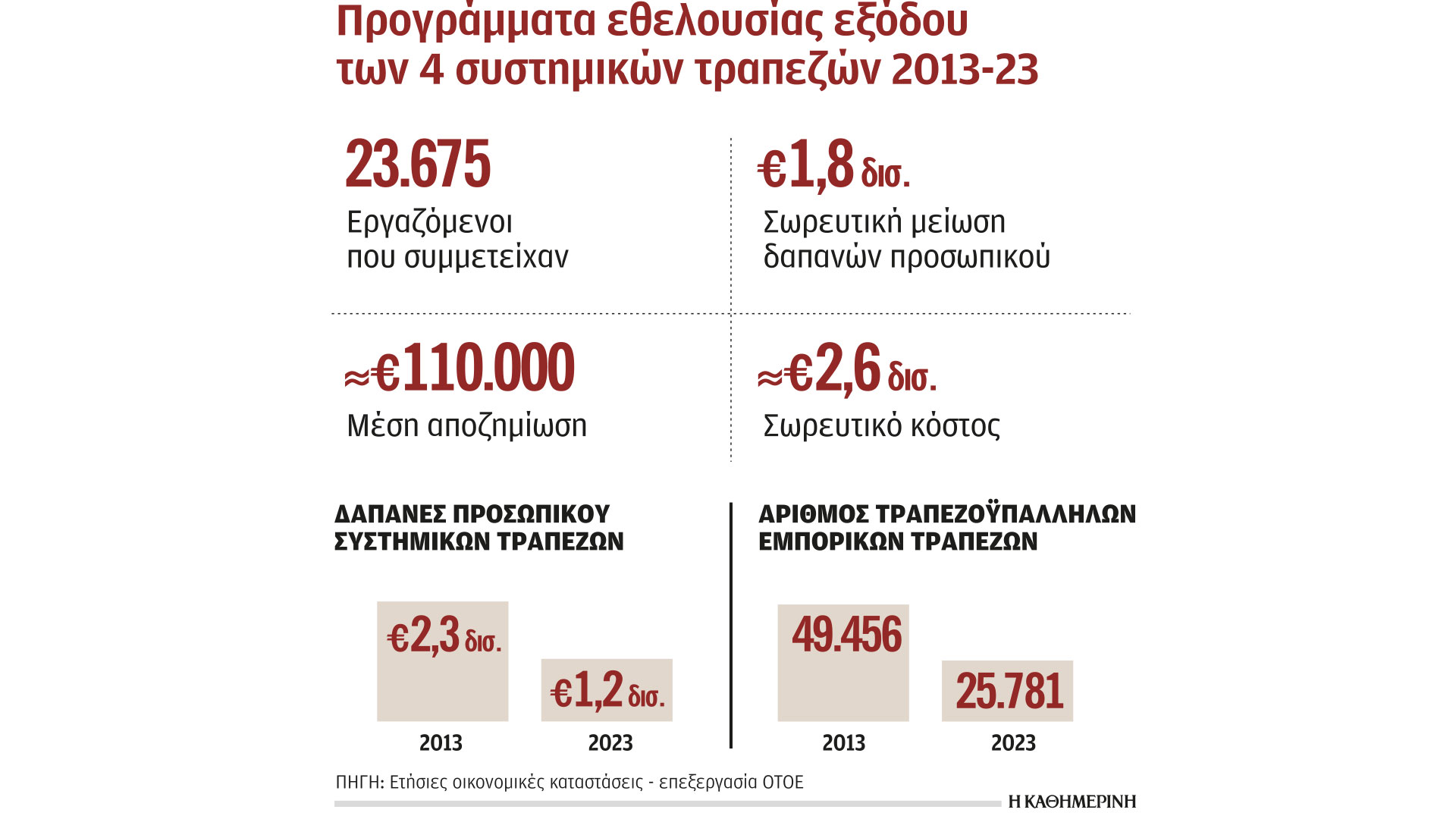 Πάνω από 2,6 δισ. ευρώ έχουν κοστίσει την τελευταία δεκαετία τα προγράμματα εθελουσίας εξόδου που έχουν εφαρμόσει οι τέσσερις συστημικές τράπεζες, μέσω των οποίων έχουν μειώσει περίπου στο μισό τον αριθμό των τραπεζοϋπαλλήλων. Πρόκειται για 23.675 πρώην εργαζομένους στις τράπεζες, οι οποίοι μεταξύ 2013 και 2023 είδαν την πόρτα της εξόδου με μέσο κόστος αποζημίωσης περί τις 110.000 ευρώ ανά εργαζόμενο.