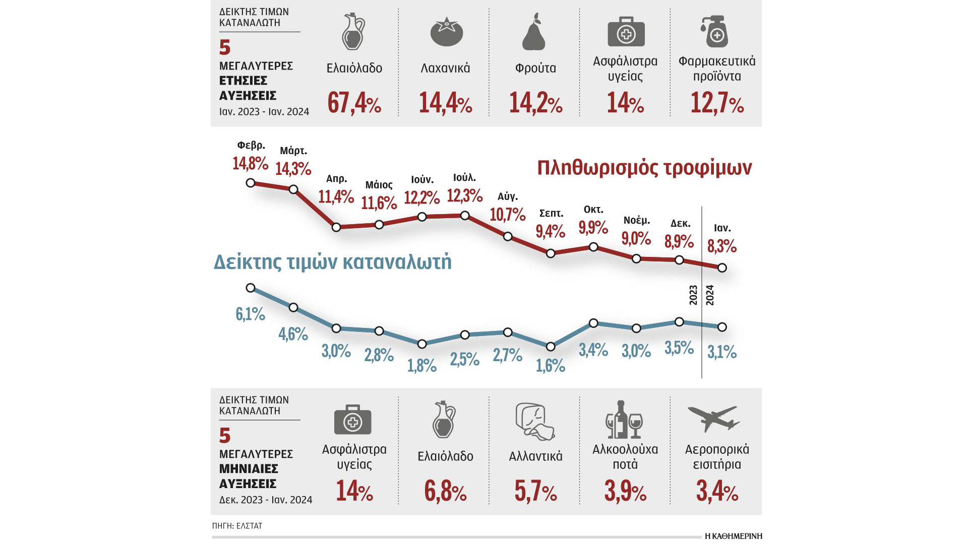 Αξίζει να σημειωθεί ότι το προϊόν με τη μεγαλύτερη αύξηση τιμής σε ετήσια βάση, 67,4%, είναι το ελαιόλαδο, ενώ μόνο μέσα σε ένα μήνα, τον Ιανουάριο του 2024 σε σύγκριση με τον Δεκέμβριο του 2023 κατεγράφη αύξηση της τιμής του κατά 6,8%. Σε αρκετά μάλιστα τρόφιμα-ποτά κατεγράφησαν σημαντικές αυξήσεις μέσα σε ένα μήνα, π.χ. στα αλλαντικά (5,7%), στα αλκοολούχα ποτά (3,9%), στα νωπά λαχανικά (2,8%), στο γιαούρτι (2,8%).