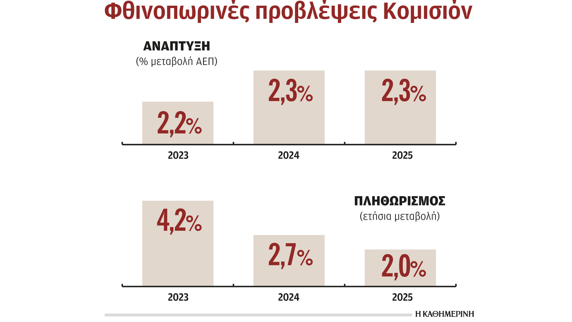 Για το 2023 οι χειμερινές προβλέψεις της Κομισιόν αναφέρουν ρυθμό ανάπτυξης 2,2%, χαμηλότερο έναντι των προηγούμενων, φθινοπωρινών προβλέψεων, αλλά και της κυβερνητικής εκτίμησης στον προϋπολογισμό για 2,4%. Και για το 2025 η πρόβλεψη είναι για 2,3% έναντι προηγούμενης για 2,2%.