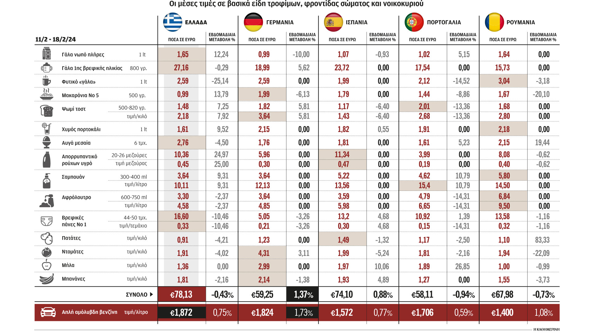 Για ποιο λόγο το «καλάθι» της Γερμανίας είναι από τα φθηνότερα –όχι μόνο στη σύγκριση που πραγματοποιεί η «Καθημερινή», αλλά και γενικότερα στις έρευνες τιμών– ενώ δεν καταγράφονται σημαντικές αυξομειώσεις και κυρίως αυξήσεις στις τιμές; Η άμεση απάντηση είναι ότι πρόκειται για μια πολύ μεγάλη αγορά και επομένως πιο ανταγωνιστική, καθώς και ότι έχει χαμηλότερο ΦΠΑ (ο βασικός συντελεστής ΦΠΑ στη Γερμανία είναι 19%, ενώ σε κάποια τρόφιμα ο συντελεστής ΦΠΑ είναι 7%).