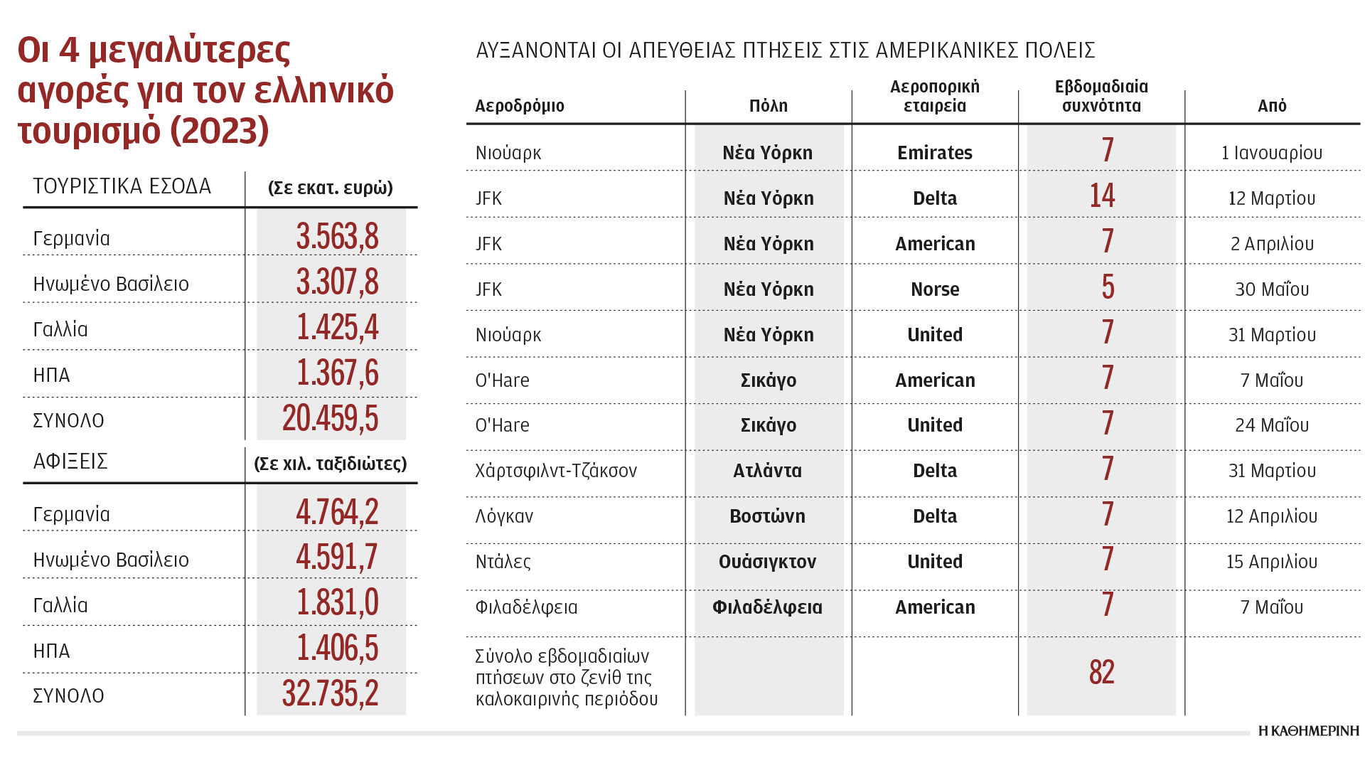 Η αμερικανική αγορά είναι πλέον η τέταρτη μεγαλύτερη για τον ελληνικό τουρισμό μετά τη γερμανική, τη βρετανική και τη γαλλική και αν συνεχίσει με αυτούς τους ρυθμούς θα ξεπεράσει τη γαλλική. Τα στοιχεία ωστόσο είναι ενθαρρυντικά και για τη φετινή χρονιά, καθώς ο προγραμματισμός αεροπορικών θέσεων από τις ΗΠΑ είναι αυξημένος ήδη και οι επιβεβαιωμένες κρατήσεις εισιτηρίων, σύμφωνα με τα στοιχεία του airdata tracker του INSETE, για το 2024 είναι 3,2% υψηλότερες απ’ ό,τι την ίδια στιγμή το αντίστοιχο περυσινό διάστημα (τέλη Ιανουαρίου).