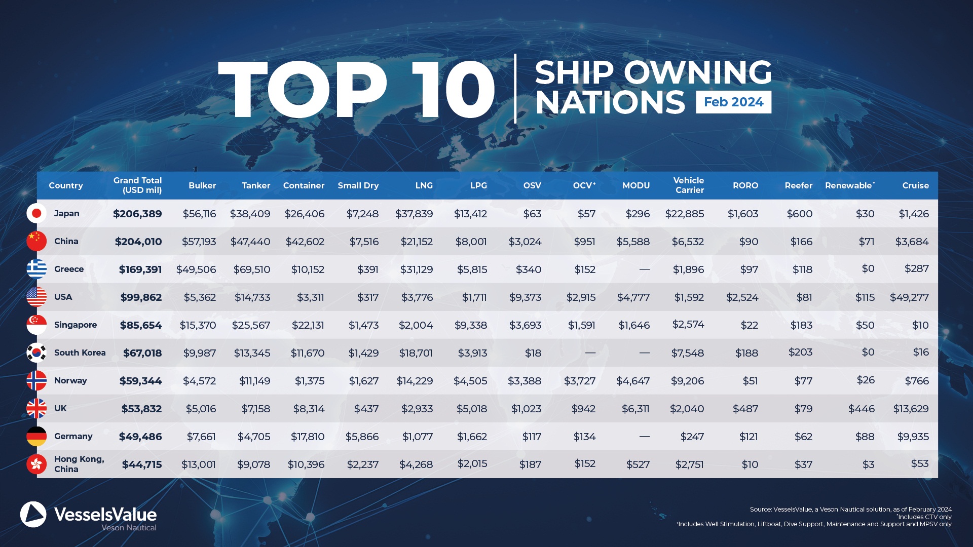Στην πρώτη θέση βρίσκονται οι Ιάπωνες πλοιοκτήτες με στόλο αξίας σχεδόν 206,4 δισ. δολαρίων και ακολουθούν από κοντά οι Κινέζοι με πλοία συνολικής αξίας 204 δισ. δολαρίων. Στην τέταρτη βρίσκονται οι Αμερικανοί με πλοία αθροιστικής αξίας σχεδόν 100 δισ. δολαρίων (η μισή αξία όμως αφορά σε κρουαζιερόπλοια) και ακολουθεί η Σιγκαπούρη με 85,6 δισ. δολάρια.