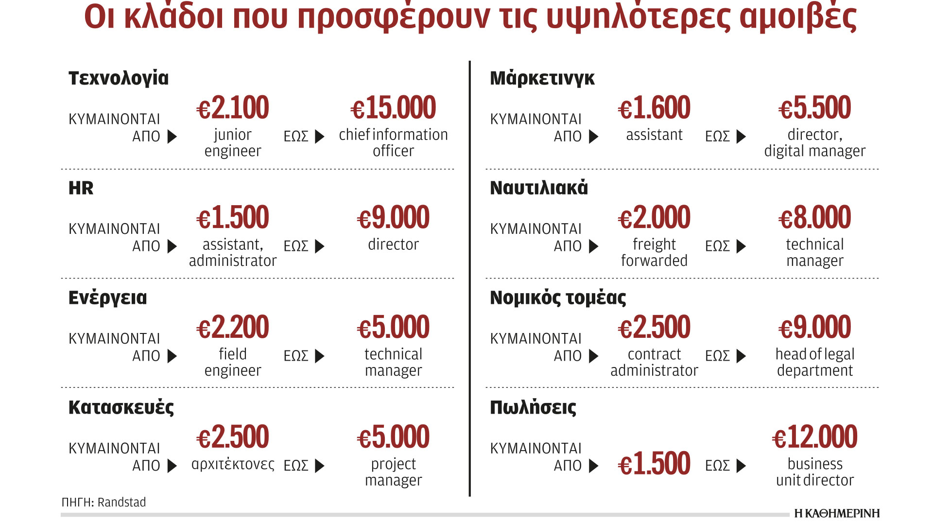 Σύμφωνα με την ίδια έρευνα, τις καλύτερες προοπτικές προσλήψεων παρουσιάζουν οι τομείς της τεχνολογίας και των πωλήσεων, με ποσοστό 54% και 48% αντίστοιχα, ενώ στην τρίτη θέση βρίσκονται οι μηχανικοί. Και αυτό δεν είναι τυχαίο, αφού μακράν οι καλύτερες αμοιβές προσφέρονται στον κλάδο της τεχνολογίας, ενώ οι λεγόμενοι «χρυσοί» μισθοί, που μπορεί να ξεπερνούν και τα 10.000 ευρώ τον μήνα (μεικτά) προσφέρονται σε διευθυντικά στελέχη, εκ των οποίων τις καλύτερες αποδοχές έχουν οι επικεφαλής των τμημάτων πληροφορικής (έως 15.000 ευρώ), οι διευθυντές πωλήσεων (12.000 ευρώ) και οι οικονομικοί διευθυντές (10.000 ευρώ).