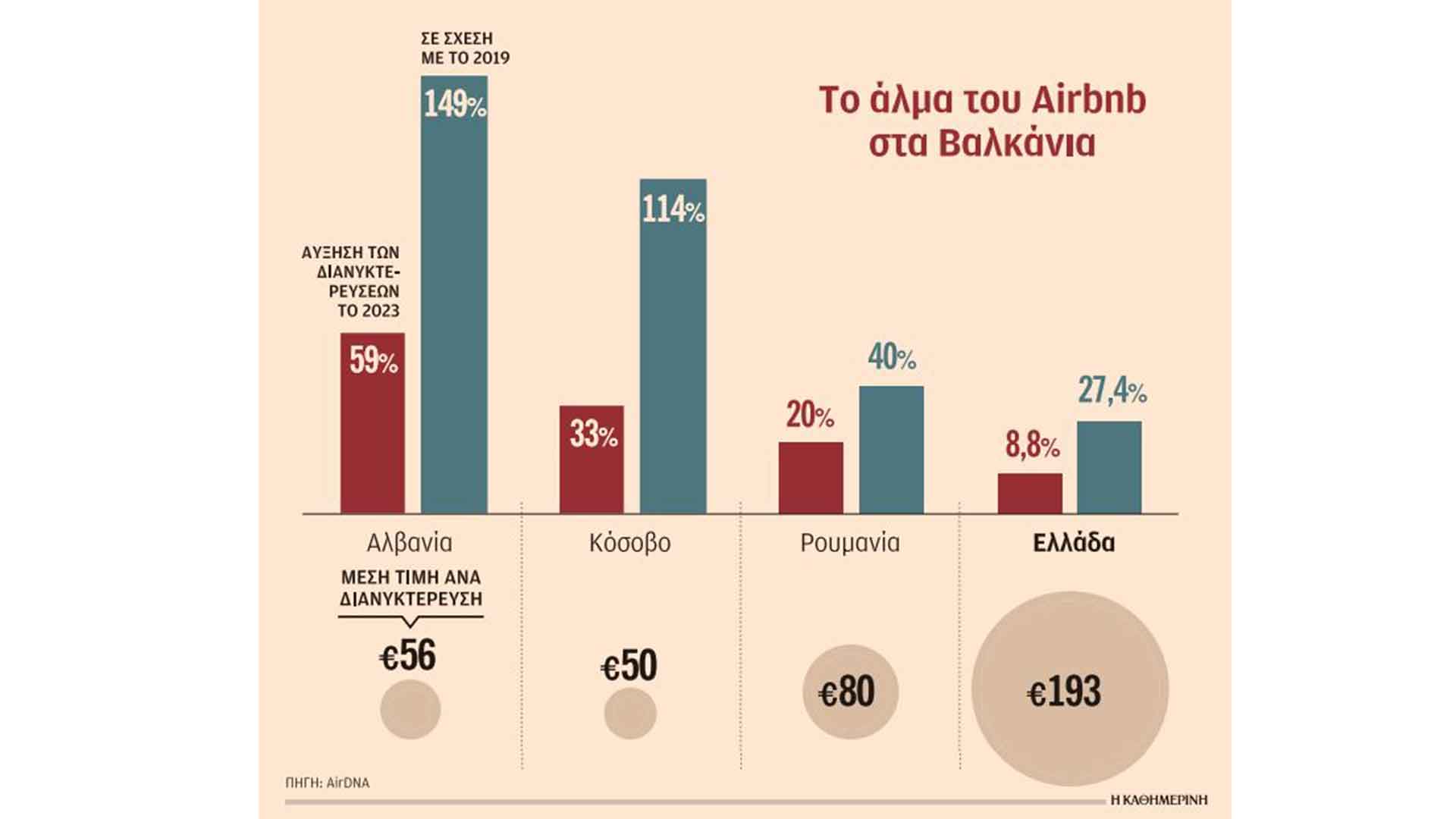 Το Κόσοβο είναι άλλη μια χώρα που ξεχώρισε το 2023, καταγράφοντας αύξηση της ζήτησης κατά 33%, ενώ συγκριτικά με το 2019, οι περυσινές διανυκτερεύσεις ήταν κατά 114% υψηλότερες. Αντίστοιχα, στη Ρουμανία κατεγράφη αύξηση 20% σε σχέση με το 2022, αλλά και 40% συγκριτικά με το 2019. Την ίδια στιγμή, στην Ελλάδα, η ζήτηση για βραχυχρόνιες μισθώσεις αυξήθηκε κατά 8,8% το 2023, ενώ συγκριτικά με το 2019, η περυσινή επίδοση ήταν κατά 27,4% καλύτερη του 2019, δηλαδή του τελευταίου έτους πριν από το ξέσπασμα της πανδημίας.