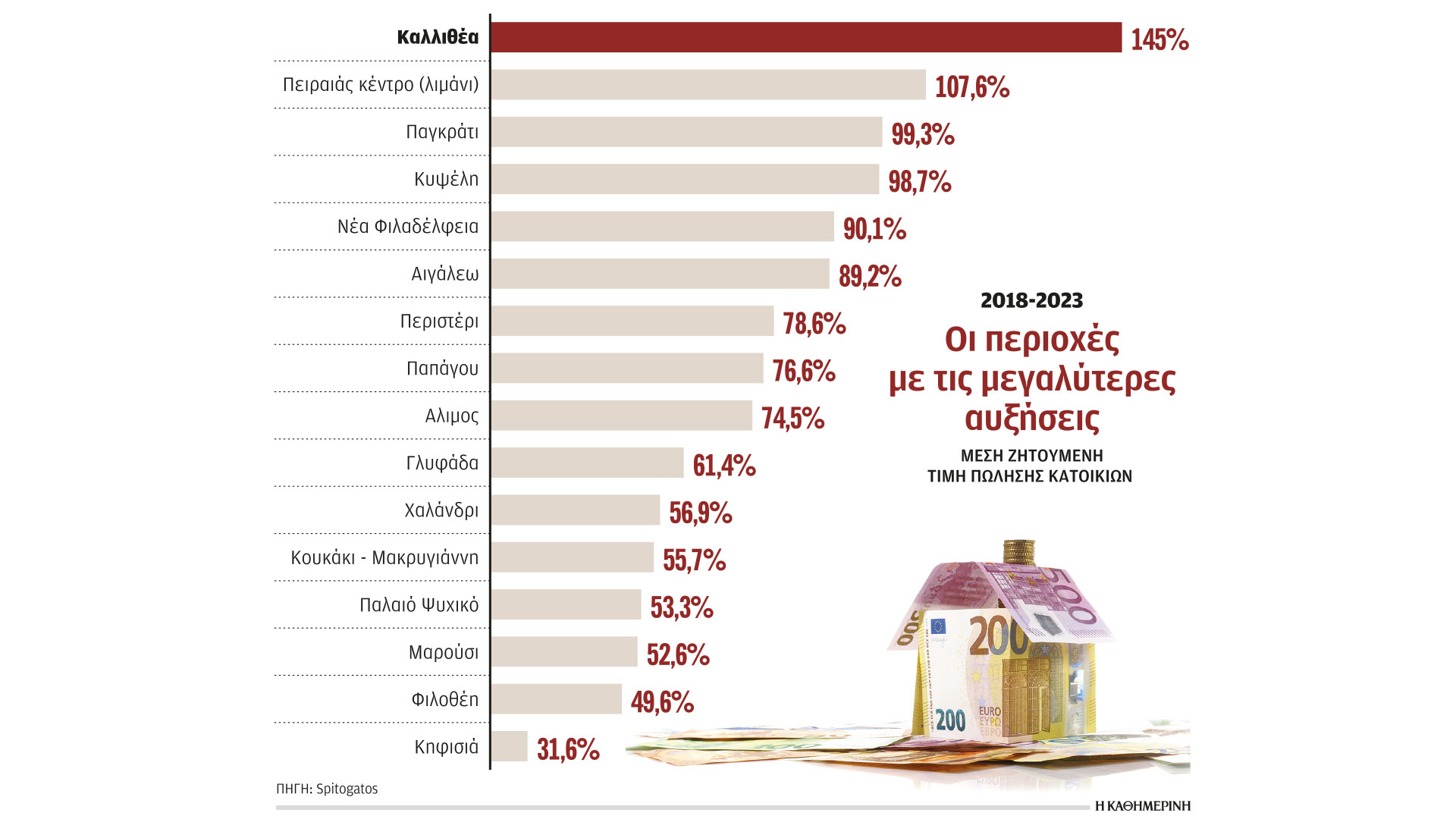 Σύμφωνα με τα στοιχεία του δικτύου ηλεκτρονικών αγγελιών ακινήτων Spitogatos, κατά το διάστημα αυτό, τις μεγαλύτερες αυξήσεις τιμών σημείωσαν οι κατοικίες στην Καλλιθέα με 145%, στο κέντρο του Πειραιά με 107,6%, στο Παγκράτι με 99,3%, στην Κυψέλη με 98,7%, αλλά και στη Νέα Φιλαδέλφεια με 90,1% Μεγάλες αυξήσεις παρατηρούνται και σε άλλες περιοχές, όπως π.χ. στο Αιγάλεω με 89,2%, το Περιστέρι με 78,6% και στου Παπάγου με 76,6%.
