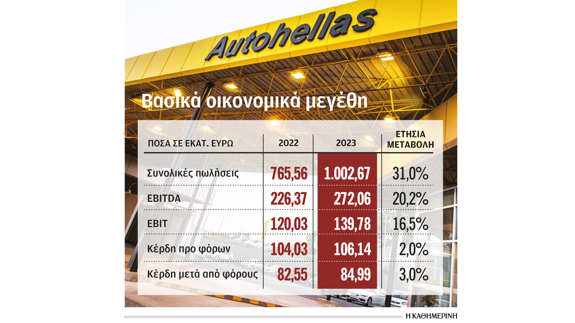 Νέο ιστορικό ρεκόρ μεγεθών κατέγραψε πέρυσι, για τρίτη χρονιά, ο όμιλος μίσθωσης και εμπορίας οχημάτων Autohellas. Ειδικότερα, το 2023, έναντι του 2022, ο όμιλος ενίσχυσε κατά 31% τον τζίρο, σε ελαφρώς περισσότερο από 1 δισ. ευρώ, ενισχύοντας κατά 20,2%, σε 272,1 εκατ. ευρώ, και τα κέρδη προ τόκων, φόρων και αποσβέσεων (EBITDA). Tα λειτουργικά κέρδη (EBIT) αυξήθηκαν κατά 16,5%, σε 139,8 εκατ. ευρώ, ενώ τα κέρδη μετά φόρων ενισχύθηκαν κατά 3%, σε περίπου 85 εκατ. ευρώ. Σημειώνεται ότι τα έσοδα ύψους 174 εκατ. ευρώ από τη δραστηριότητα της FCA Greece (FIAT/JEEP/ALFA Romeo), που απέκτησε η Autohellas από κοινού με τη Samelet τον Μάιο του 2023 (μετονομάστηκε σε Italian Motion), δεν περιλαμβάνονται στον ενοποιημένο κύκλο εργασιών διότι ενοποιούνται μόνο με τη μέθοδο της καθαρής θέσης. Ωστόσο, κατά την Autohellas, το σημαντικό ύψος εσόδων της συγκεκριμένης δραστηριότητας προσαυξάνει ακόμη περισσότερο τη συνολική δραστηριότητα και δυναμική του ομίλου.