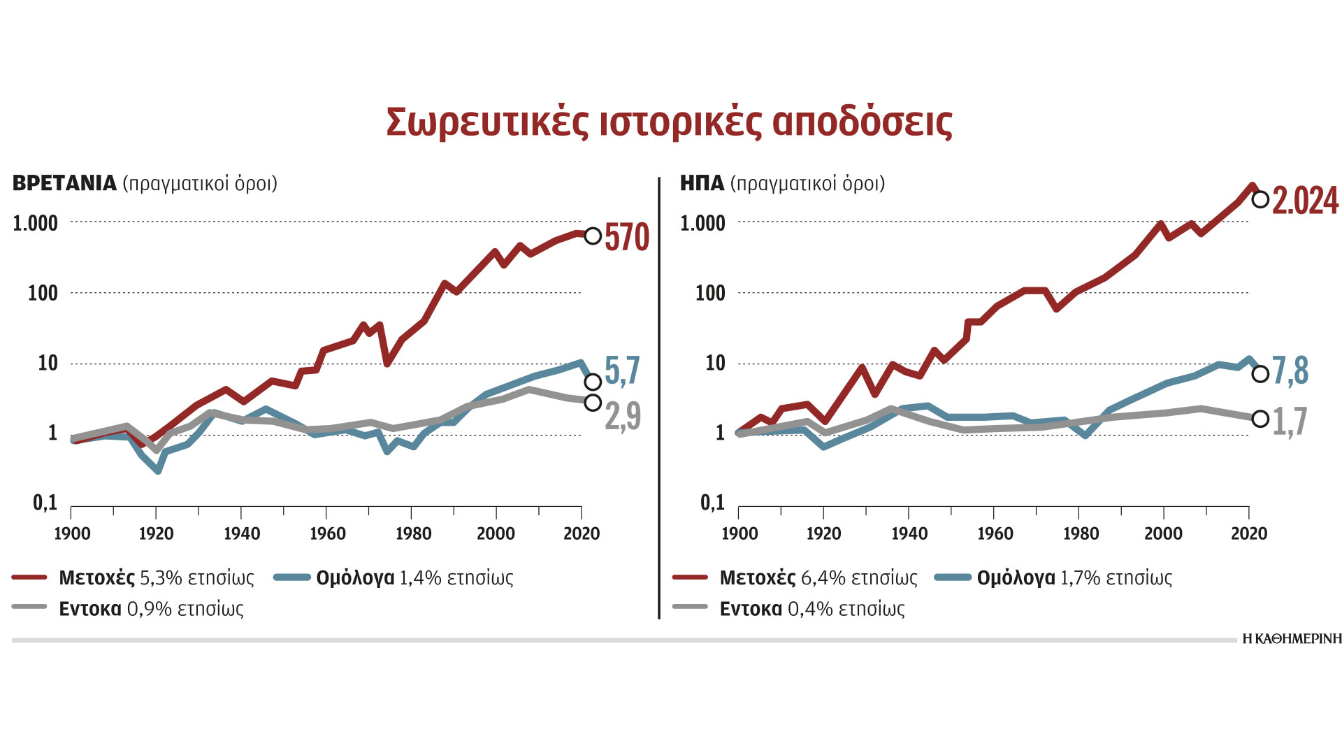 Σύμφωνα με τον κ. Βολίκα και βάσει συμπερασμάτων από αξιόπιστες μελέτες, διαπιστώνεται ότι σε βάθος χρόνου οι επενδύσεις σε μετοχές υπερέχουν σημαντικά. Κάτι που φαίνεται και από τα διαγράμματα που παρουσιάζει η «Κ».