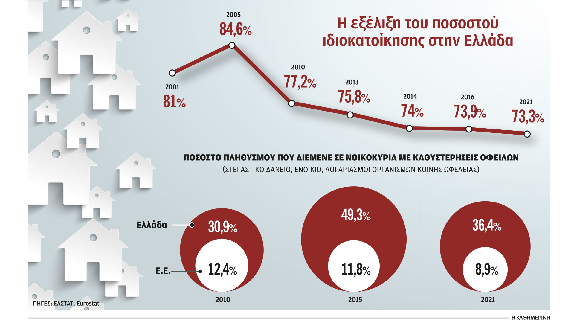 Μια νέα πραγματικότητα έχει πλέον διαμορφώσει η πολυετής οικονομική κρίση στην αγορά κατοικίας, καθώς ένα αξιοσημείωτο μέγεθος του οικιστικού αποθέματος της χώρας έχει πλέον μεταφερθεί σε χέρια θεσμικών ή και ξένων επενδυτών. Αυτή η εξέλιξη αποτυπώνεται στους αριθμούς, καθώς το ποσοστό της ιδιοκατοίκησης έχει υποχωρήσει κατά 11,3 ποσοστιαίες μονάδες κατά τη διάρκεια της περιόδου 2005-2021. Συγκεκριμένα, με βάση τα στοιχεία της ΕΛΣΤΑΤ και της Eurostat, το 2021 διαμορφωνόταν σε 73,3%, ελαφρώς υψηλότερο από το 70% του συνόλου της Ε.Ε. Το 2005 το αντίστοιχο ποσοστό στην Ελλάδα διαμορφωνόταν σε 84,6%.