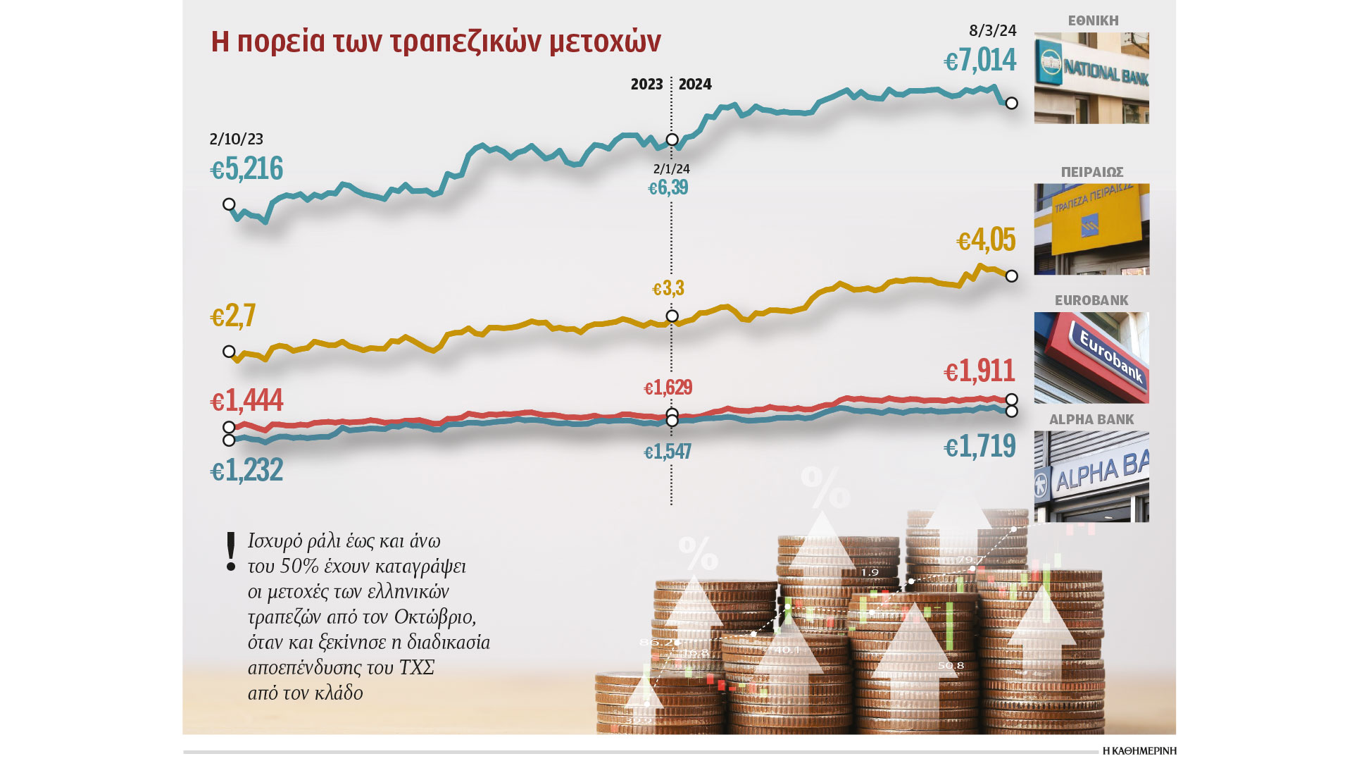 Οπως επισημαίνει στην «Κ» ο κ. Ανδρέας Σουβλερός, αναλυτής της Eurobank Equities, οι πρόσφατες κινήσεις αποεπένδυσης του ΤΧΣ προσέλκυσαν το έντονο ενδιαφέρον των επενδυτών κυρίως λόγω της σημαντικής βελτίωσης στα οικονομικά μεγέθη τους. Αυτό περιλαμβάνει τη βελτίωση στην ποιότητα του χαρτοφυλακίου, την κερδοφορία και την κεφαλαιακή επάρκεια, καθιστώντας τες πλέον συγκρίσιμες με άλλες ευρωπαϊκές τράπεζες. Κατά τον κ. Σουβλερό, οι ελληνικές τράπεζες ευνοήθηκαν περισσότερο από τις υπόλοιπες ευρωπαϊκές από την αύξηση των επιτοκίων λόγω του χαμηλότερου κόστους καταθέσεων που έχουν και του μεγάλου ποσοστού (90%) σε κυμαινόμενα δάνεια.