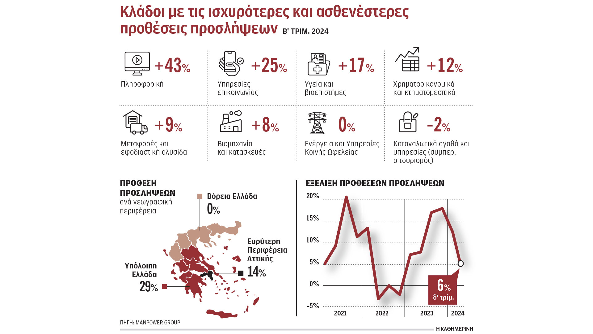 Σε επίπεδο περιοχών (αριστερό γράφημα), αυτή της υπόλοιπης Ελλάδας αναμένει τις ισχυρότερες προθέσεις προσλήψεων το δεύτερο τρίμηνο του 2024 (29%).