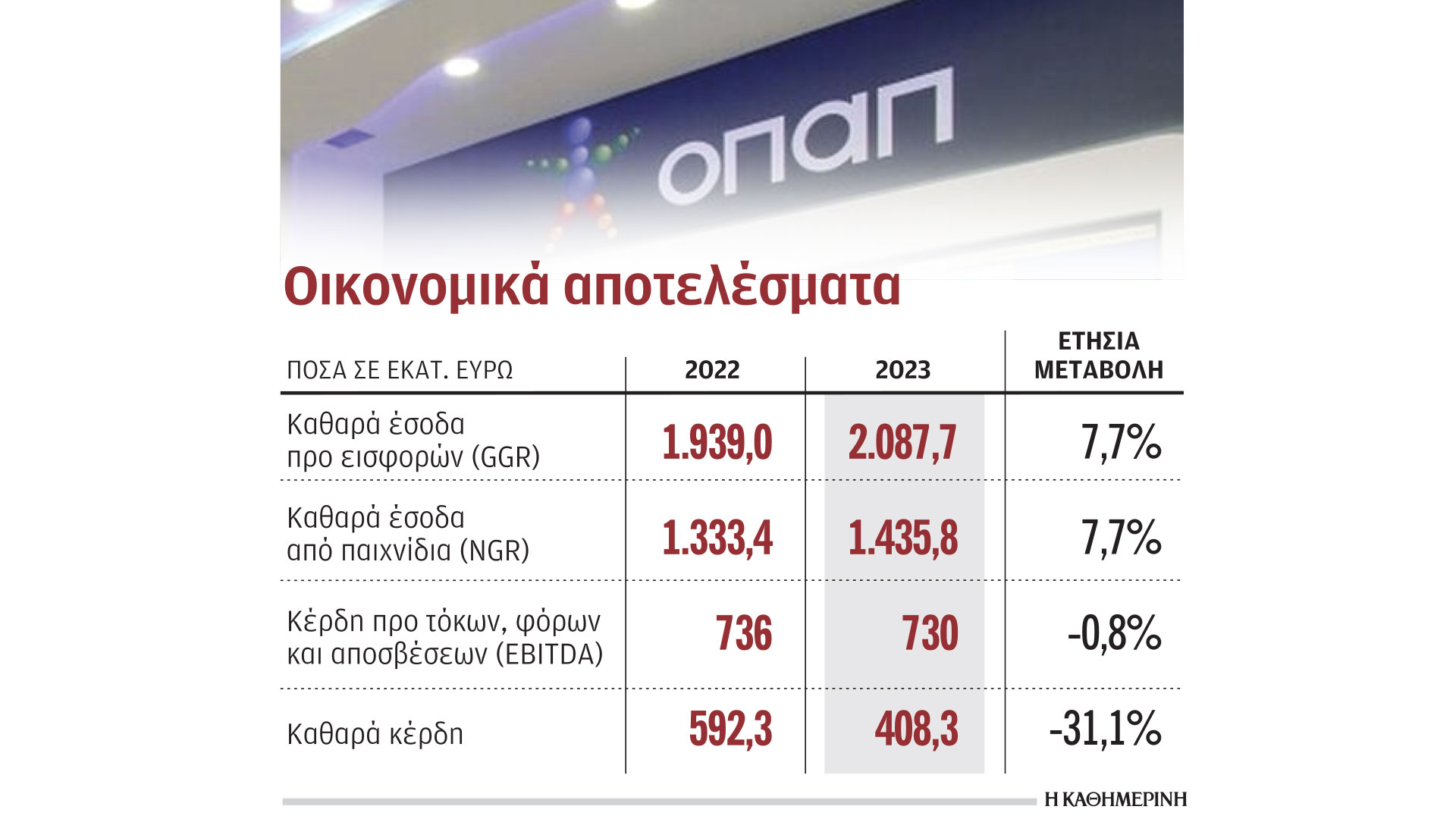 Ιστορικό ρεκόρ εσόδων εμφάνισε ο ΟΠΑΠ κατά το τέταρτο τρίμηνο του 2023, με τον όμιλο να προτείνει τη διανομή μερίσματος ύψους 1,85 ευρώ ανά μετοχή για την περασμένη χρήση. Ειδικότερα, ο ΟΠΑΠ ενίσχυσε κατά το τέταρτο τρίμηνο της περασμένης χρονιάς, σε ετήσια βάση, κατά 7,5% τα καθαρά έσοδα προ εισφορών (GGR), σε 581,2 εκατ. ευρώ ως αποτέλεσμα της ισχυρής επίδοσης στα διαδικτυακά τυχερά παιχνίδια, σε συνδυασμό με την υγιή ανάπτυξη της επίγειας δραστηριότητας. Σε επίπεδο έτους, τα GGR αυξήθηκαν κατά 7,7%, σε 2,088 δισ. ευρώ, έναντι του 2022, ενώ κατά την ίδια περίοδο τα λειτουργικά κέρδη προ φόρων, τόκων και αποσβέσεων (Ebitda) υποχώρησαν κατά 0,8% σε ετήσια ή κατά 0,2% σε επαναλαμβανόμενη βάση, σε 730 εκατ. ευρώ. Το 2023 τα καθαρά κέρδη υποχώρησαν, ετησίως, κατά 31,1%, σε 408,3 εκατ. ευρώ, με το συγκεκριμένο μέγεθος να είναι μειωμένο κατά 67,2%, κατά το τέταρτο τρίμηνο του 2023, σε 100,6 εκατ. ευρώ κυρίως λόγω έκτακτου κέρδους το 2022. Για το 2024, ο ΟΠΑΠ προβλέπει την εμφάνιση εσόδων από 2,15 έως 2,2 δισ. ευρώ και Ebitda από 750 εκατ. έως 770 εκατ. ευρώ.