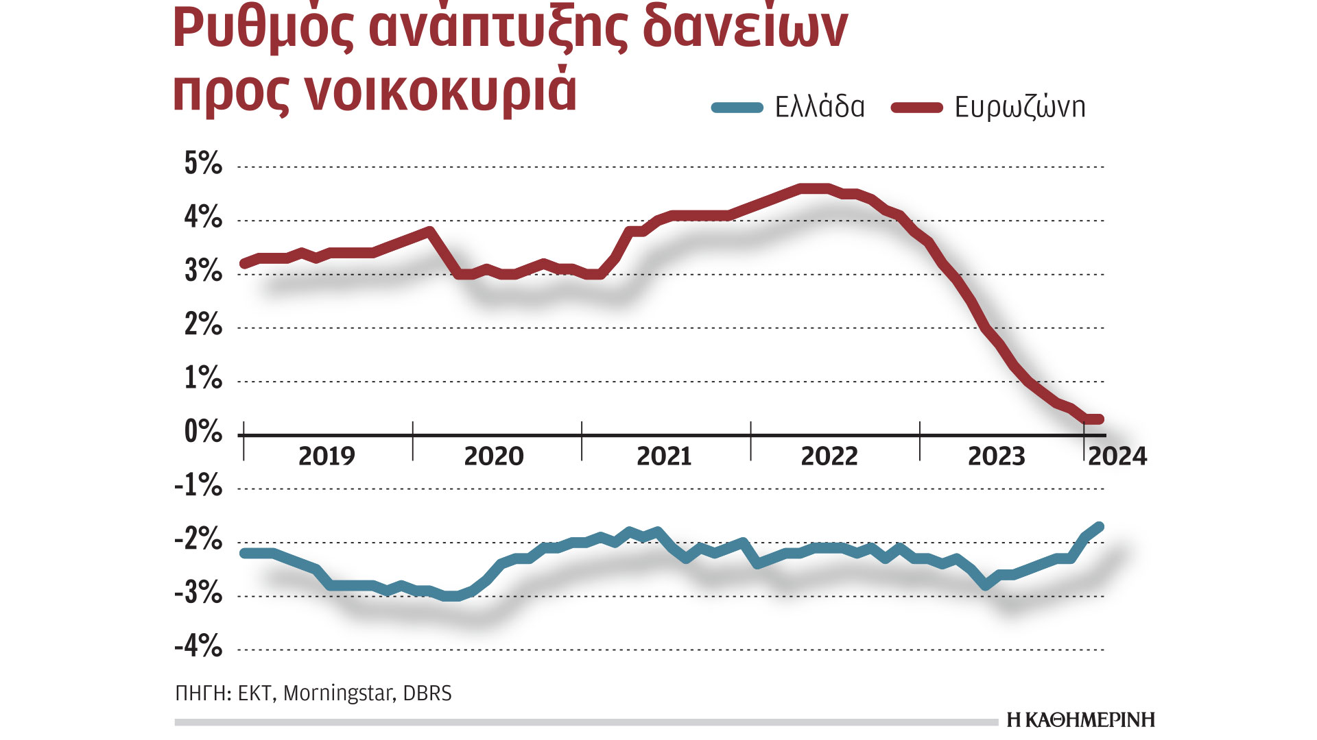 Σταθερά τις χειρότερες επιδόσεις στις χορηγήσεις δανείων προς τα νοικοκυριά έχει η Ελλάδα, καταγράφοντας συνεχιζόμενο αρνητικό ρυθμό, που διαμορφώθηκε στο -1,7% τον Ιανουάριο έναντι αύξησης 0,3% στην Ευρωζώνη. Αυτό επισημαίνει σε σχετική έκθεση που δημοσίευσε χθες η DBRS, επικεντρώνοντας στην «υποτονική παραγωγή νέων στεγαστικών δανείων».