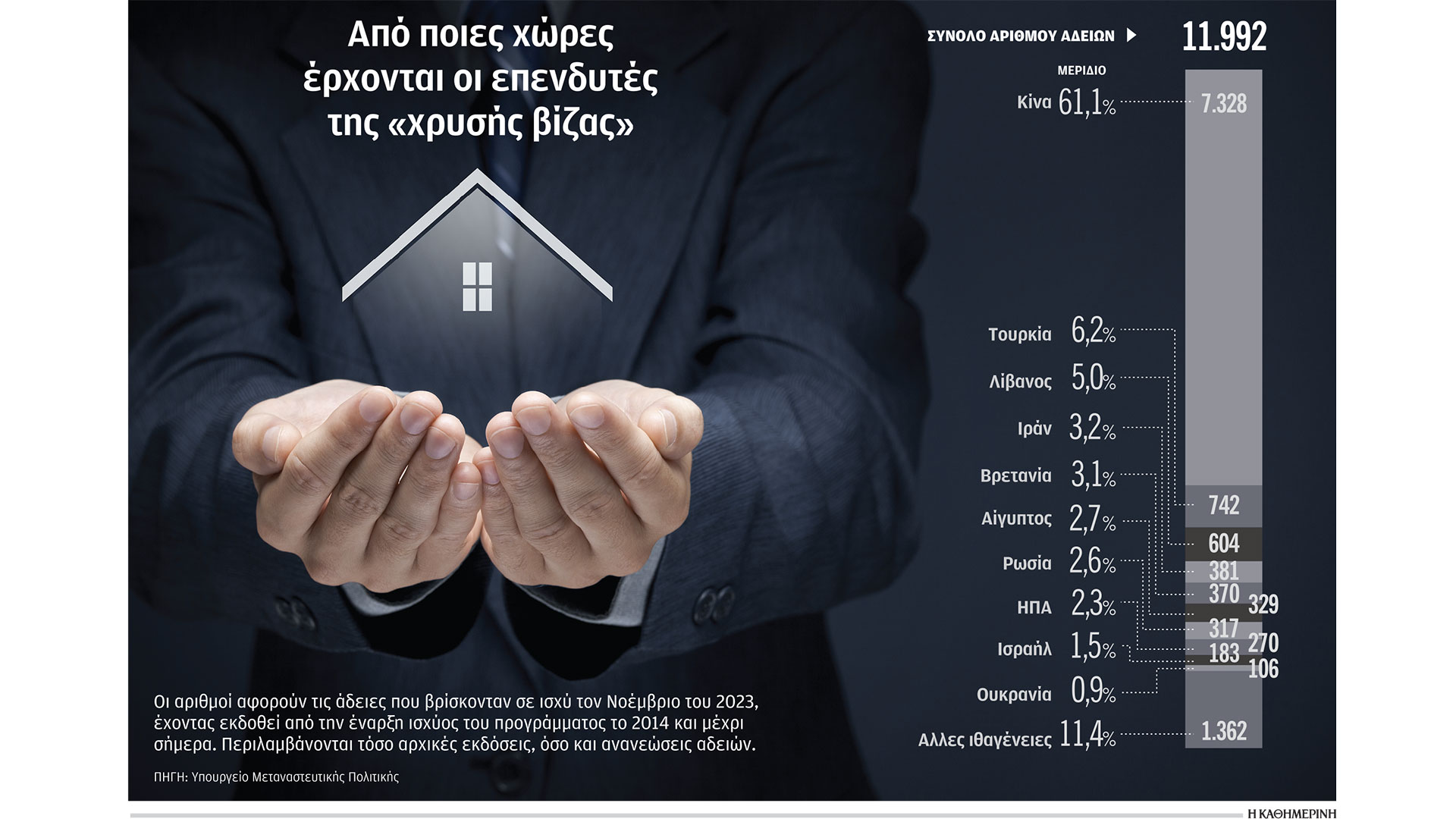 Σταθερά πρώτοι στην κατάταξη για την αγορά ακινήτων μέσω της «χρυσής βίζας» είναι οι Κινέζοι, ενώ σημαντική αύξηση καταγράφεται την τριετία 2021-2023 από τις χώρες της Μέσης Ανατολής, αλλά και από τη Βρετανία. Την πρώτη δεκάδα στο τέλος του 2023 συνθέτουν οι εξής: Κίνα, Τουρκία, Λίβανος, Ιράν, Βρετανία, Αίγυπτος, ΗΠΑ, Ισραήλ, Ρωσία και Ουκρανία.