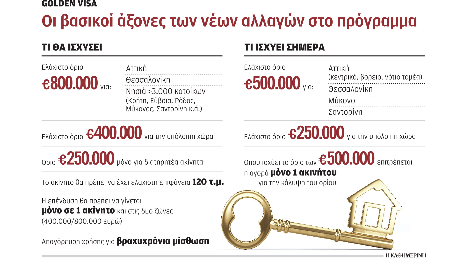 «Κλειδώνουν» οι μεταβολές στο πρόγραμμα «χρυσή βίζα», που πλέον θα απευθύνεται σε σαφώς μικρότερο αριθμό επενδυτών. Σύμφωνα με ασφαλείς πληροφορίες, οι αλλαγές θα είναι πολλές και σημαντικές. Κατ’ αρχάς στις Περιφέρειες Αττικής και Θεσσαλονίκης και σε όλα τα νησιά άνω των 3.000 κατοίκων το ελάχιστο ύψος της επένδυσης θα αυξηθεί στις 800.000 ευρώ. Σήμερα ισχύει όριο 500.000 ευρώ μόνο στο κέντρο της Αθήνας, στα βόρεια και τα νότια προάστια, στον Δήμο Θεσσαλονίκης, στη Μύκονο και στη Σαντορίνη. Ετσι, περιοχές όπως η Εύβοια, η Κρήτη και όλοι οι δημοφιλείς νησιωτικοί προορισμοί θα έχουν πλέον το υψηλό όριο των 800.000 ευρώ.