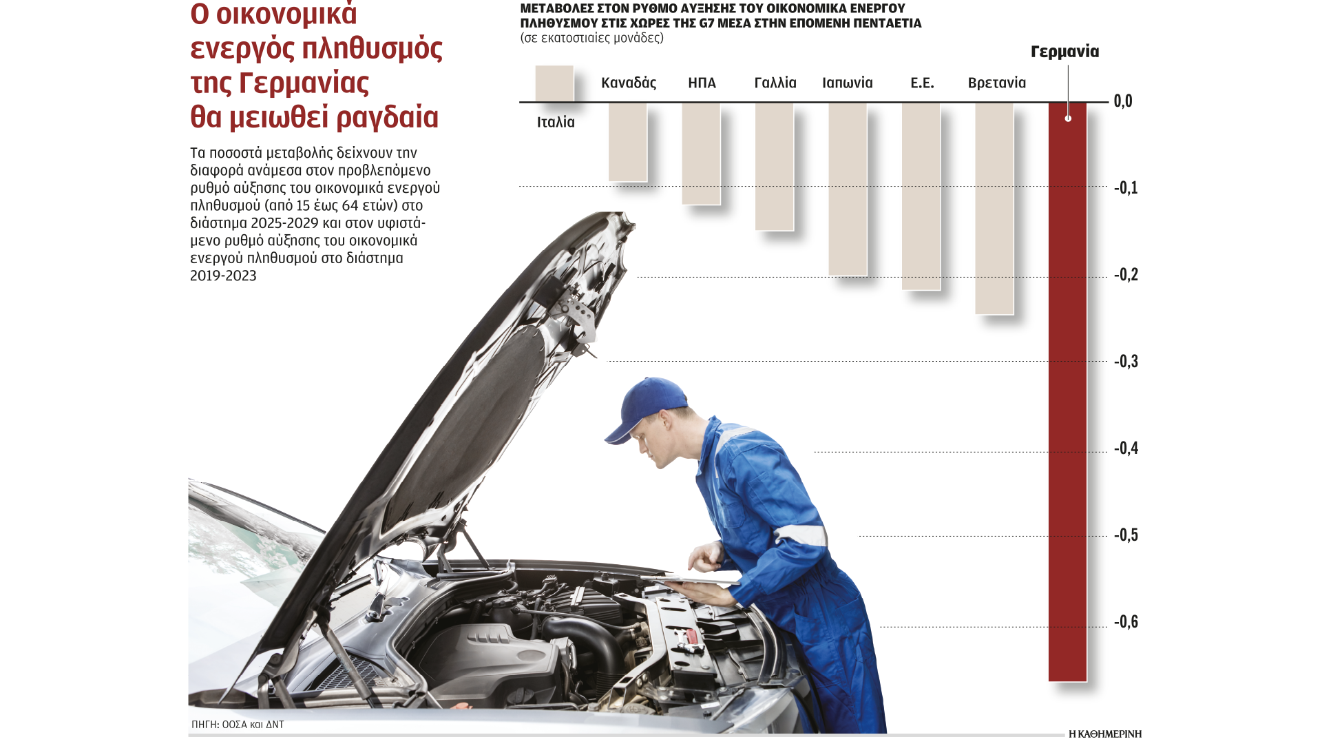 Στη διάρκεια της εβδομάδας, άλλωστε, με σχετική έκθεσή του για τη γερμανική οικονομία το ΔΝΤ έκρουσε τον κώδωνα του κινδύνου στη μεγαλύτερη ευρωπαϊκή οικονομία, που ήδη το περασμένο έτος διολίσθησε σε ύφεση. Επισήμανε πως η γήρανση του οικονομικά ενεργού πληθυσμού είναι η σημαντικότερη διαρθρωτική παθογένειά της, καθώς αποτελεί κύρια αιτία των ελλείψεων εργατικού δυναμικού. Της θύμισε πως στη διάρκεια της περασμένης δεκαετίας δέχθηκε μεγάλη τόνωση από τις μεταναστευτικές ροές που τώρα τείνουν να κοπάσουν, ενώ οδεύει προς τη σύνταξη η γενιά της μεταπολεμικής έκρηξης των γεννήσεων. Προειδοποίησε, έτσι, το Βερολίνο πως χωρίς τη στήριξη των μεταναστών το εργατικό δυναμικό της Γερμανίας θα μειωθεί στο εγγύς μέλλον περισσότερο από οποιαδήποτε άλλη χώρα του G7. Κάτι που συνεπάγεται συρρίκνωση της οικονομίας της, αφού θα αντιστοιχούν λιγότεροι εργαζόμενοι σε κάθε συνταξιούχο, ενώ θα αυξάνονται οι δαπάνες για ιατροφαρμακευτική περίθαλψη και υπηρεσίες υγείας.