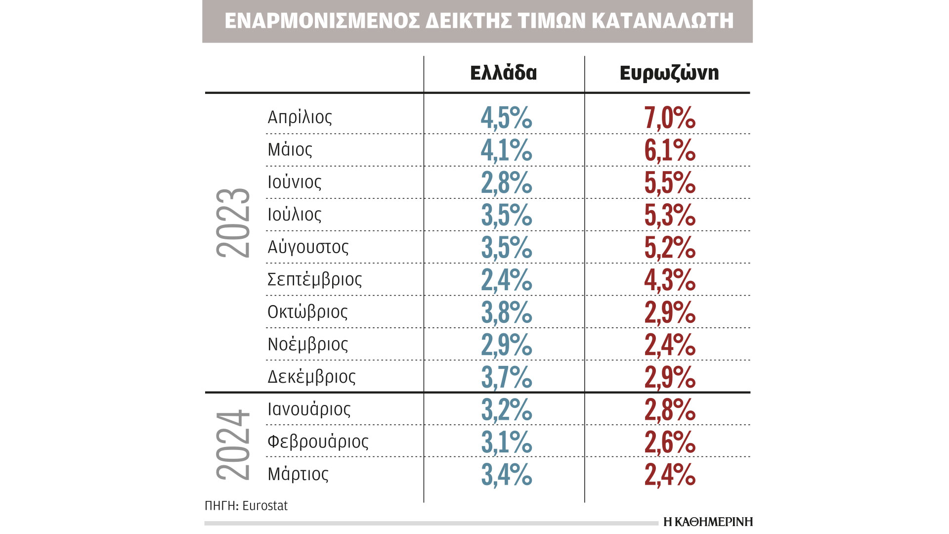 Πολύ σκληρός για να πεθάνει αποδεικνύεται ο πληθωρισμός στην Ελλάδα, ο οποίος μετά την αποκλιμάκωση που καταγράφηκε τον Ιανουάριο και τον Φεβρουάριο, ενισχύθηκε εκ νέου τον Μάρτιο και διαμορφώθηκε, σύμφωνα με τις εκτιμήσεις της Eurostat, στο 3,4%. Πρόκειται, σημειωτέον, για τον πέμπτο υψηλότερο πληθωρισμό στην Ευρωζώνη, όπου σε γενικές γραμμές καταγράφηκε αποκλιμάκωση. Συγκεκριμένα, στην Ευρωζώνη ο εναρμονισμένος δείκτης τιμών καταναλωτή διαμορφώθηκε τον Μάρτιο σε 2,4%, από 2,6%. Το πιο ανησυχητικό ίσως είναι ότι τον Μάρτιο καταγράφηκε στην Ελλάδα αύξηση του δείκτη τιμών καταναλωτή κατά 1,8% σε σύγκριση με τον Φεβρουάριο, η δεύτερη υψηλότερη μηνιαία αύξηση στην Ευρωζώνη.