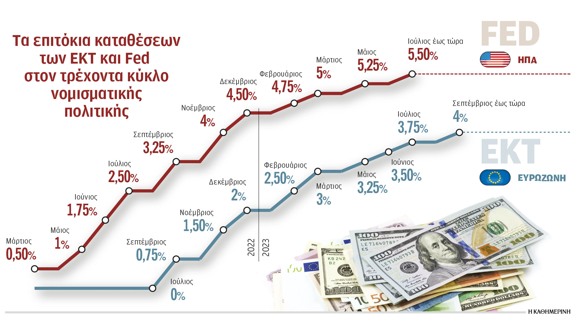 Οπως επισημαίνει στην «Κ», η Fed αύξησε τα επιτόκια σε κάθε συνεδρίαση μεταξύ Ιουνίου 2004 και Ιουνίου 2006, με 17 αυξήσεις, ενώ η πρώτη αύξηση της ΕΚΤ ήταν στα τέλη του 2005 και οι συνολικά εννέα αυξήσεις ολοκληρώθηκαν τον Ιούλιο του 2008.