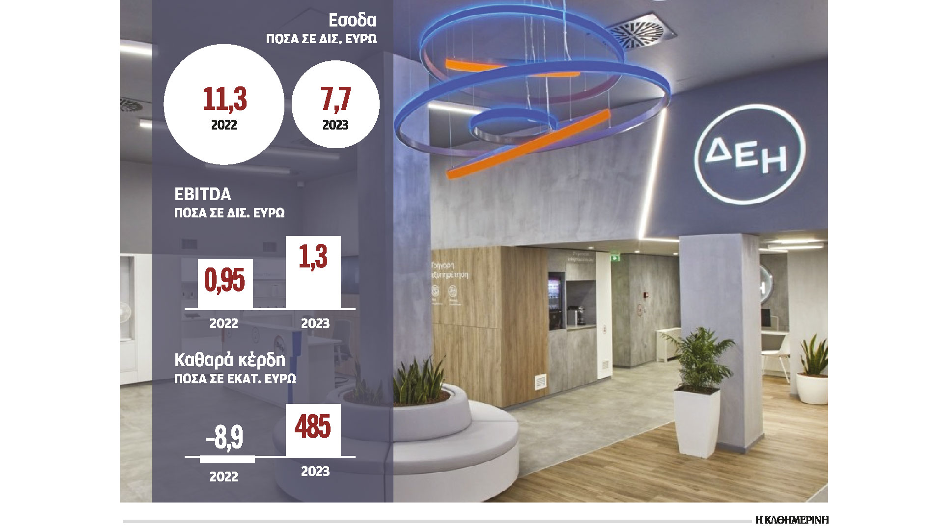 Τα καθαρά κέρδη το 2023 ανήλθαν σε 485 εκατ. ευρώ έναντι ζημιών ύψους 9 εκατ. ευρώ το 2022. Για πρώτη φορά μετά μια δεκαετία η ΔΕΗ θα διανείμει μέρισμα από τα κέρδη του 2023 στους μετόχους της. Το διοικητικό συμβούλιο θα προτείνει στην ετήσια γενική συνέλευση τη διανομή μερίσματος ύψους 0,25 ευρώ/μετοχή, που για το ελληνικό Δημόσιο μεταφράζεται σε έσοδα της τάξης των 32 εκατ. ευρώ.
