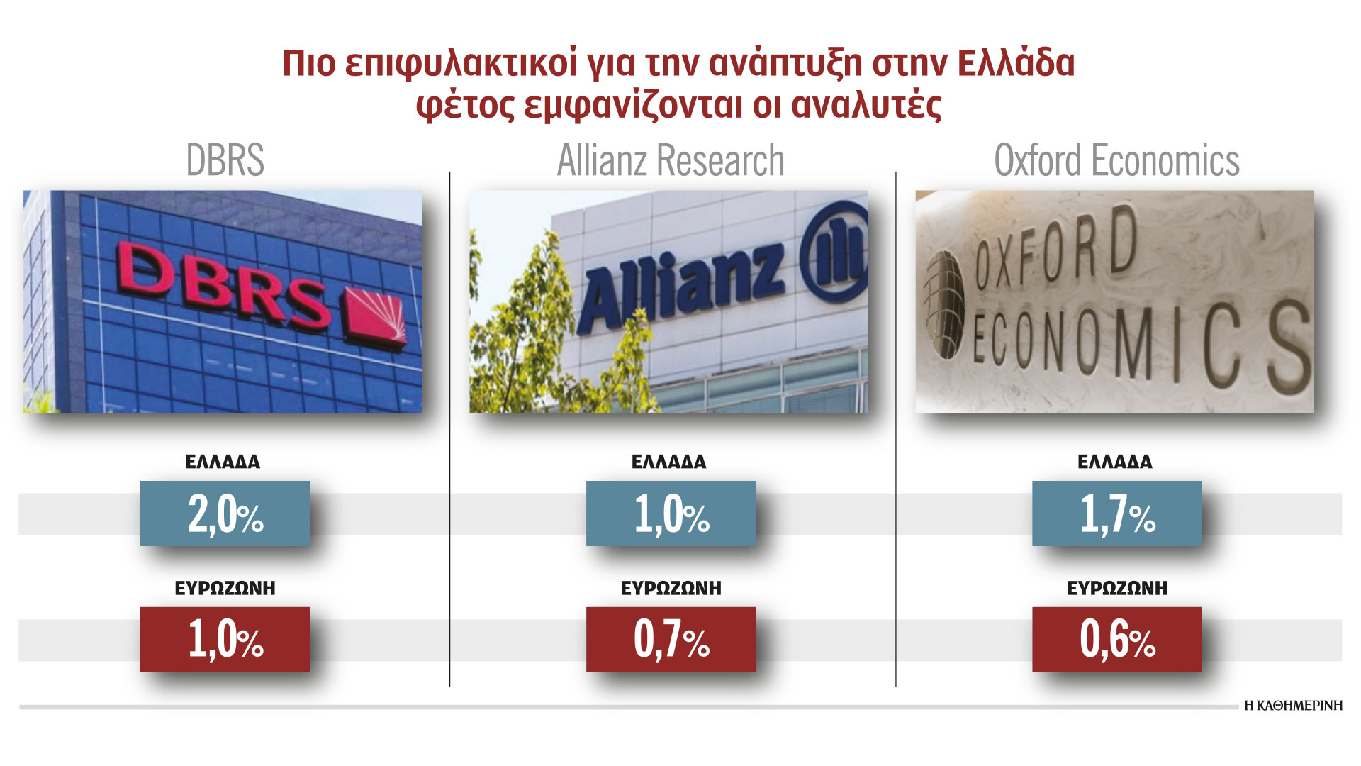 Ελαφρώς πιο αισιόδοξος εμφανίζεται ο οικονομολόγος της Oxford Economics Πάολο Γκρινιάνι, αν και εκτιμά πως η ανάπτυξη στην Ελλάδα φέτος θα ανέλθει στο 1,7%. «Ενώ μια ασθενής ανάπτυξη της Ευρωζώνης –η οποία αναμένουμε ότι φέτος θα κινηθεί με ρυθμούς της τάξης του 0,6%– θα επηρεάσει σίγουρα αρνητικά τις προοπτικές της ελληνικής οικονομίας, παραμένουμε θετικοί ως προς αυτό, καθώς η ελληνική ανάπτυξη από το 2019 οφειλόταν σε σημαντικό βαθμό στην εγχώρια ζήτηση, δηλαδή στην ιδιωτική και δημόσια κατανάλωση, καθώς και στις επενδύσεις», όπως εξηγεί στην «Κ». Βέβαια, κατά τον ίδιο, η δημόσια κατανάλωση θα επιβραδυνθεί τα επόμενα τρίμηνα, λόγω των υψηλότερων επιτοκίων και των αυστηρότερων κανόνων για το πρόγραμμα Golden Visa, αλλά αυτό δεν αναμένεται να εκτροχιάσει την τρέχουσα περίοδο σχετικά ισχυρής ανάπτυξης.